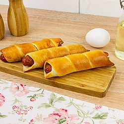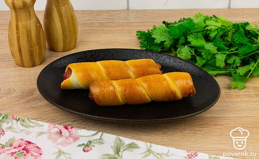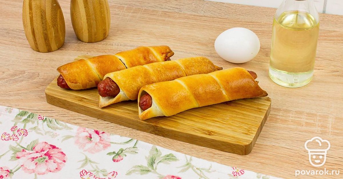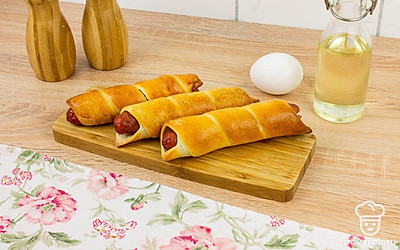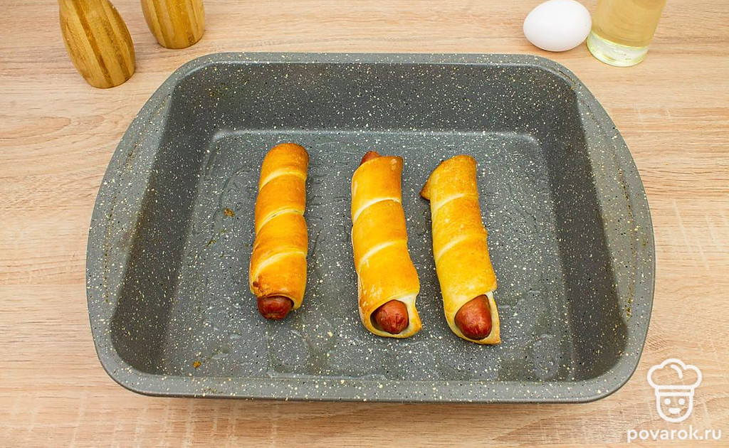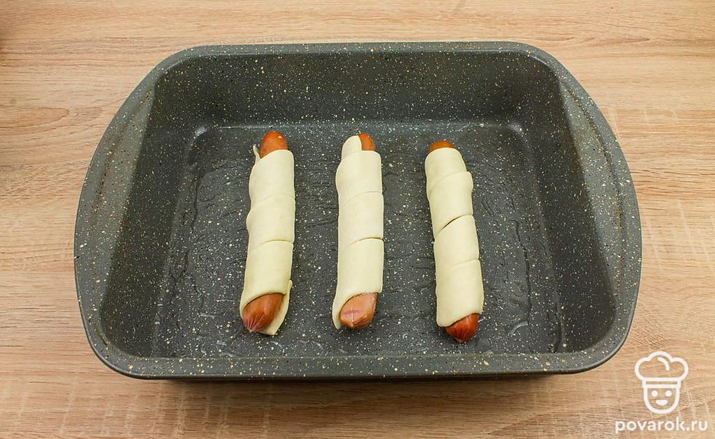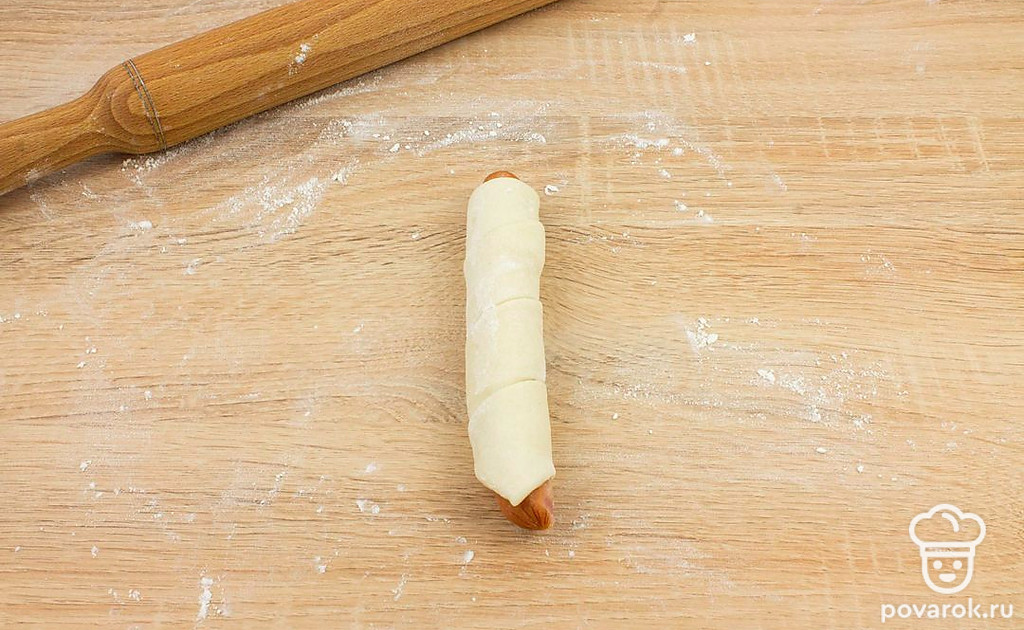 Заверните сосиски в тесто. Таким образом сформируйте все хот-доги.
