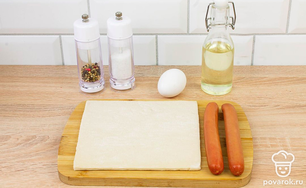 Разморозьте слоеное тесто. Очистите сосиски от упаковки. Разогрейте духовку до 180°С.