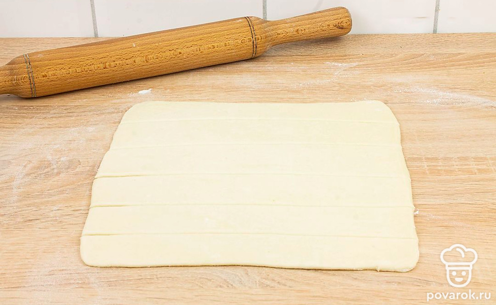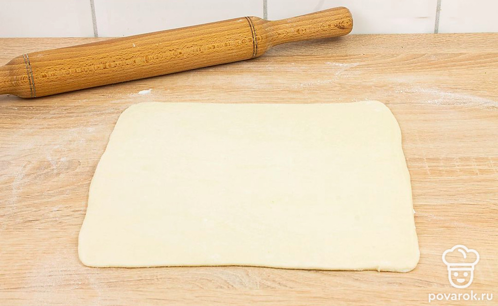 Присыпьте стол небольшим количеством муки. Выложите тесто на стол и раскатайте до толщины 3-4 мм.