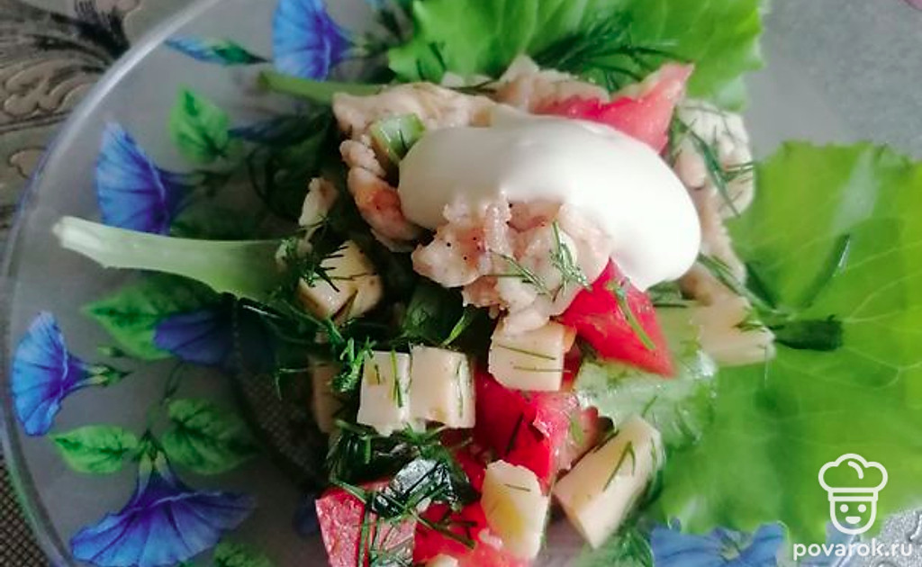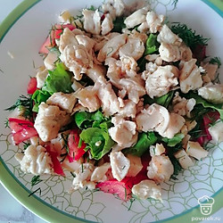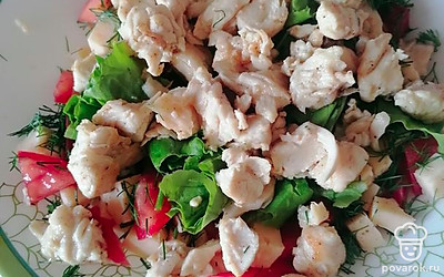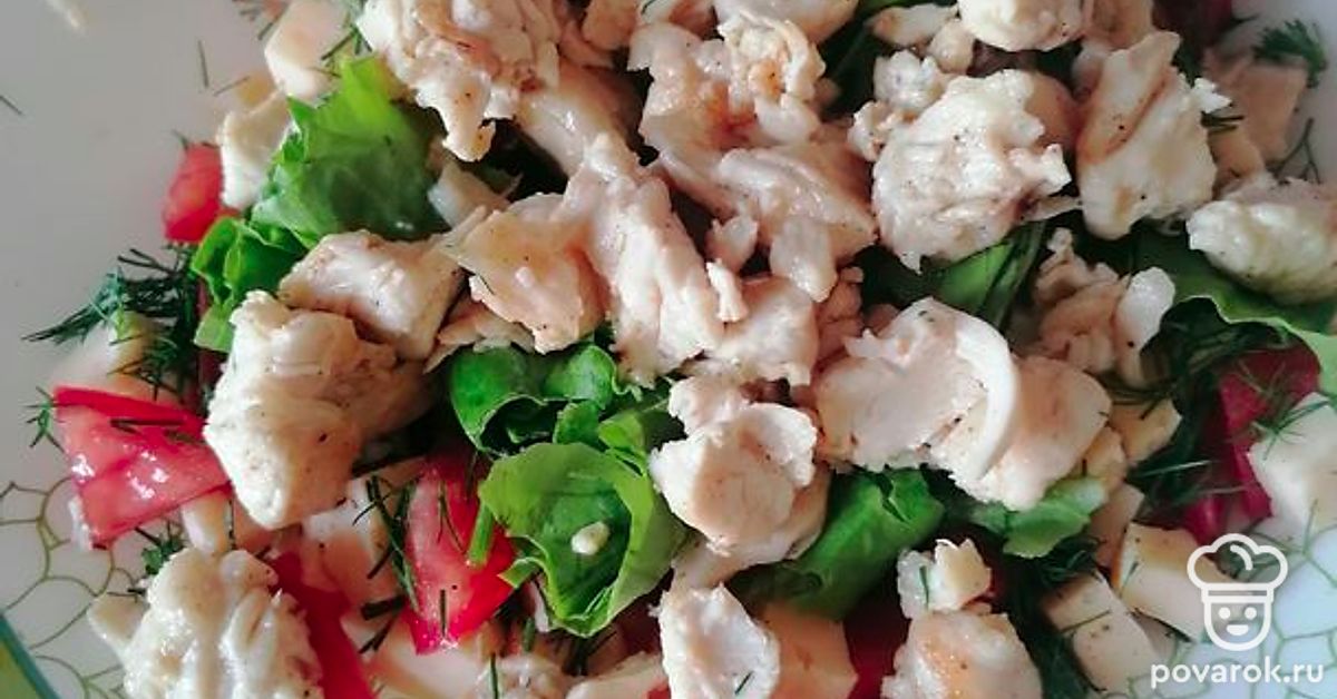 Берем малиновые помидоры, они обычно вкуснее просто красных. Режем их кубиками и добавляем в тарелку. К помидорам выкладываем сыр, укроп, зеленый салат и обжаренную грудку. Все перемешиваем и заправляем майонезом.