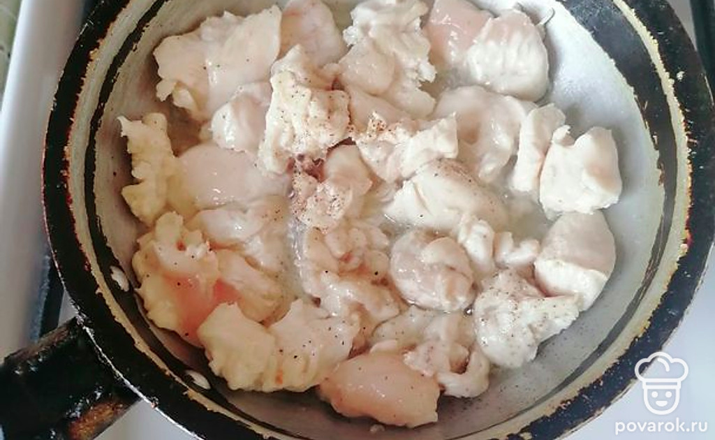 Нарезаем кусочками средними. Жарим на сковороде. Солим и перчим по вкусу. Томим не больше 10 минут.