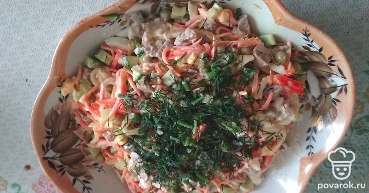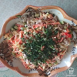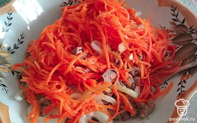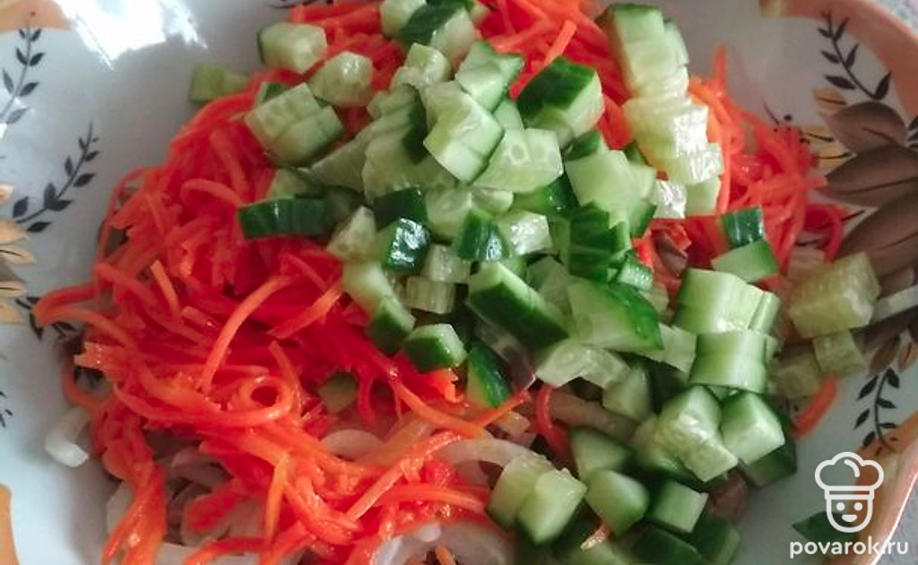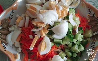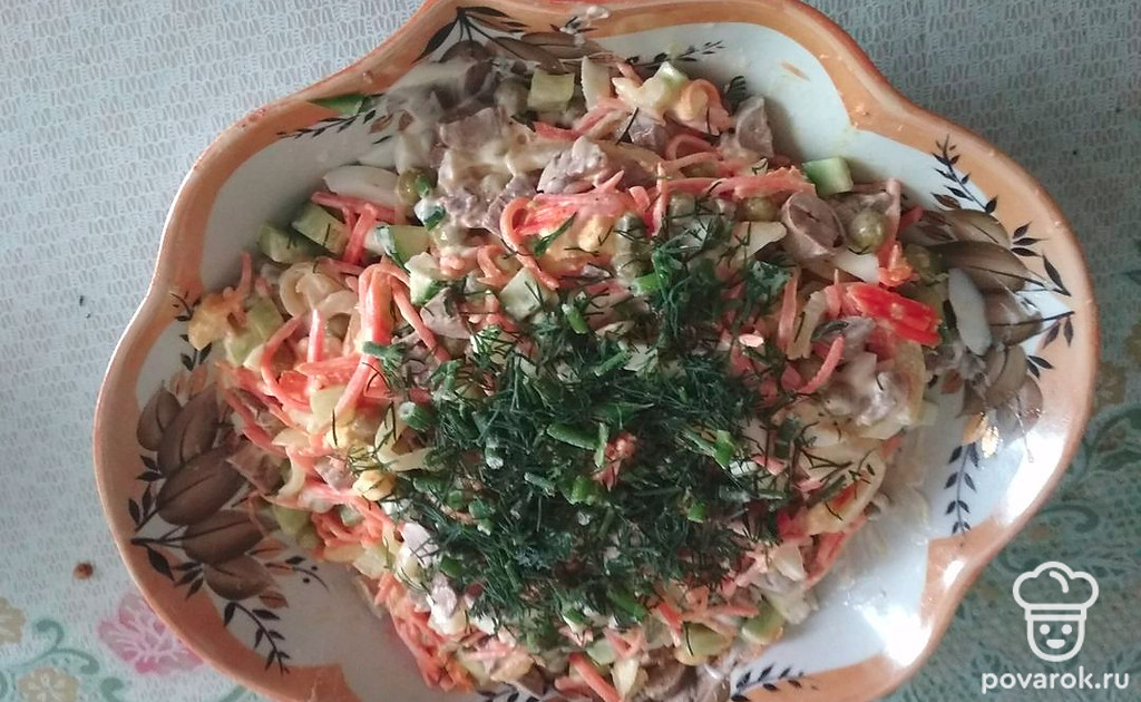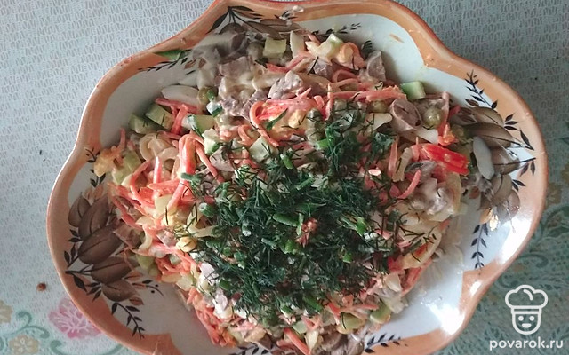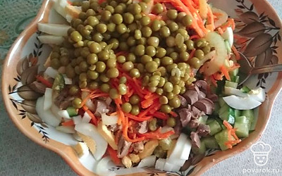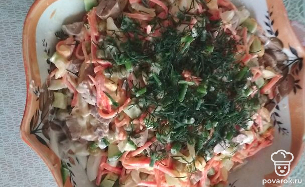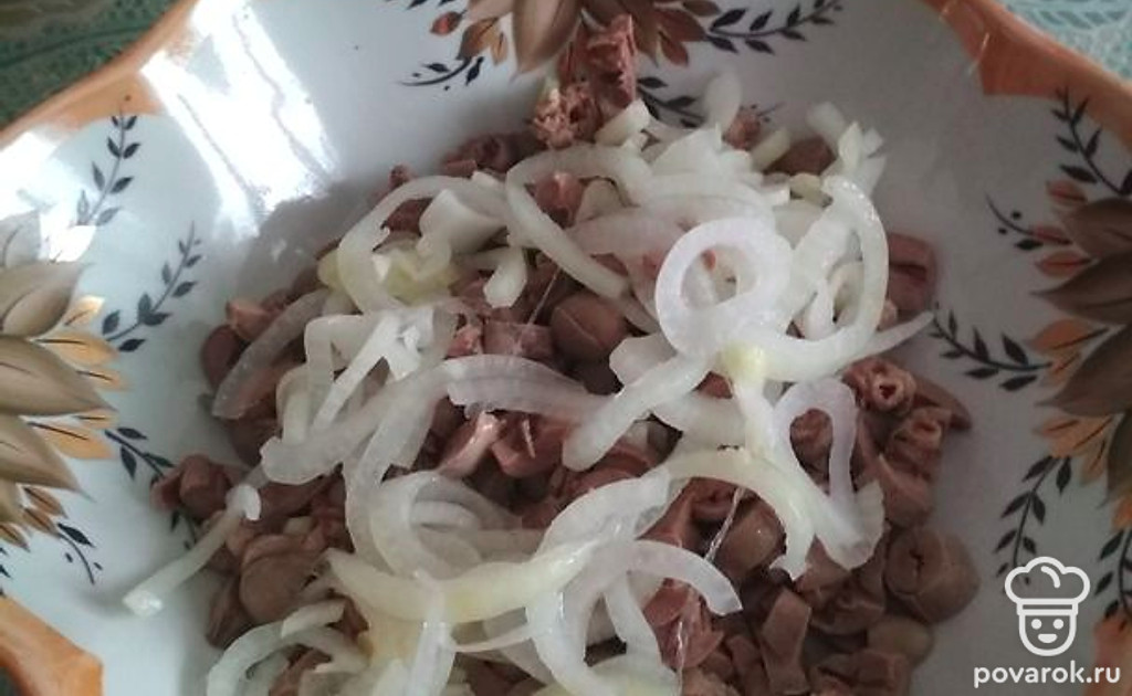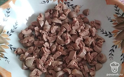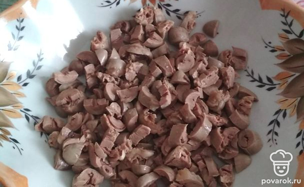 Куриные сердечки мелко нарезать и выложить в салатницу.