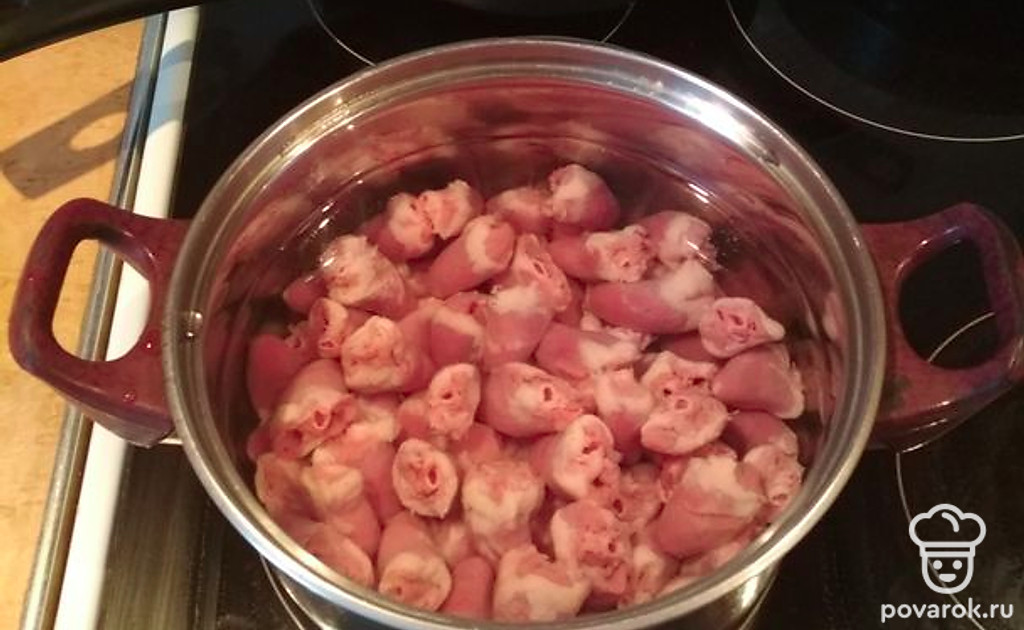 Куриные сердечки, помыть и отварить до готовности примерно час. Куриные яйца также отварить.