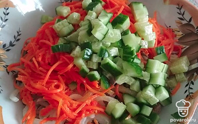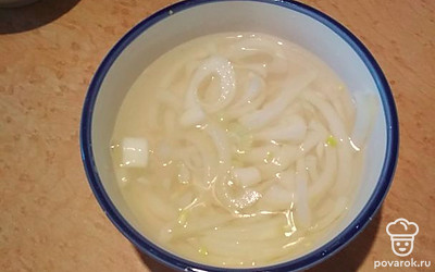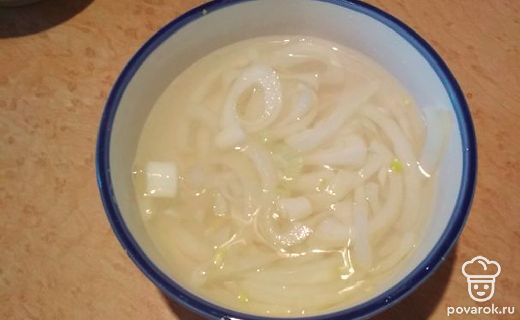 Приготовить маринованный лук. Луковицу нарезать полукольцами, добавить лимонную кислоту, сахар и залить кипятком, дать настояться. Когда вода остынет, слить.
