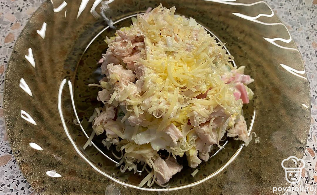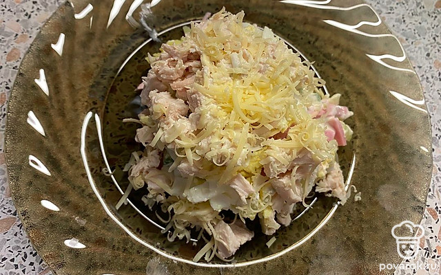 Сыр натираемь на мелкой терке, посыпаем сверху салат.