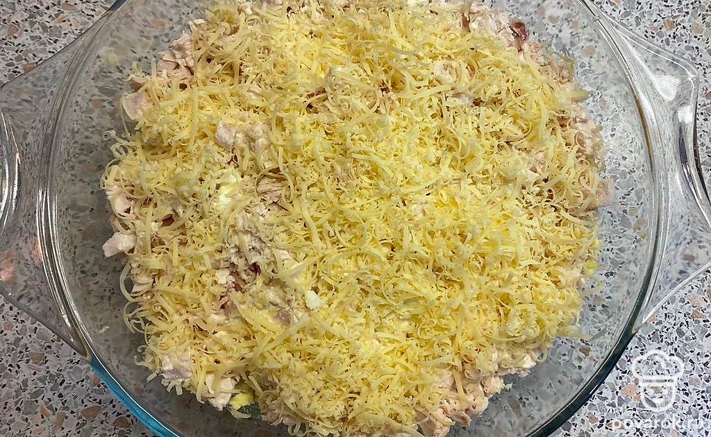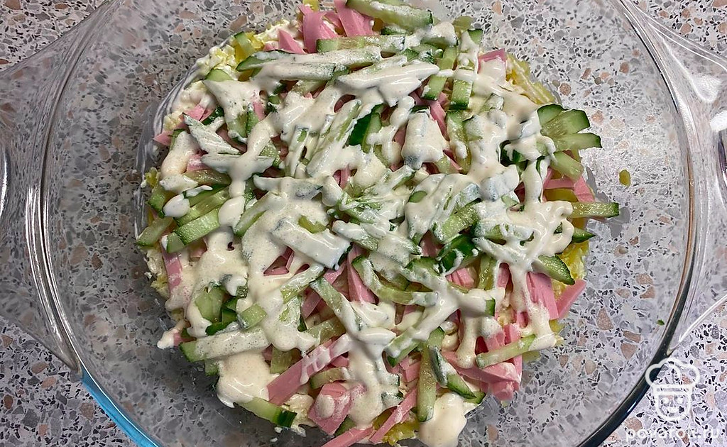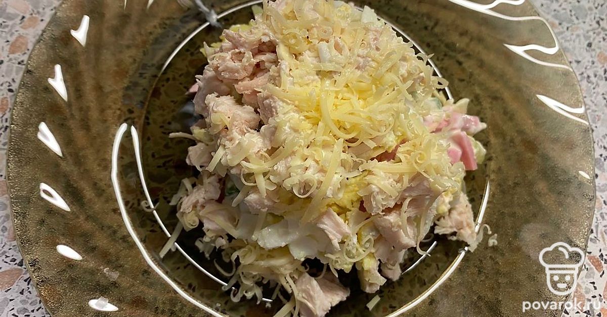 Салат «Русская красавица» с куриной грудкой и колбасой