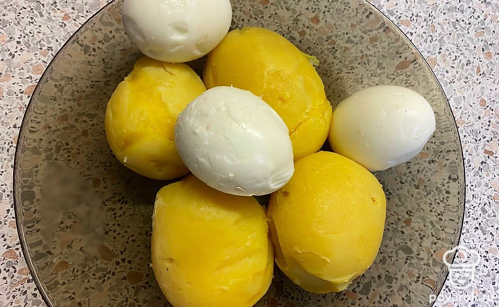 Картошку и яйца отвариваем до готовности и остужаем. Очищаем картошку от кожуры, а яйца от скорлупы.