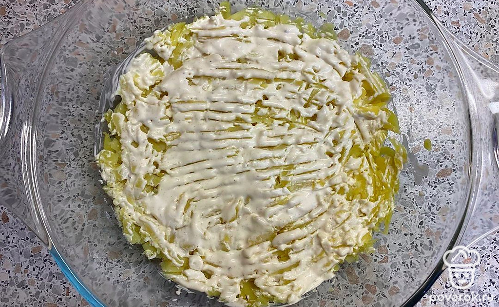 Картофель натираем на крупной терке. Выкладываем нижним слоем в форму для салата. Немного солим и смазываем майонезом.