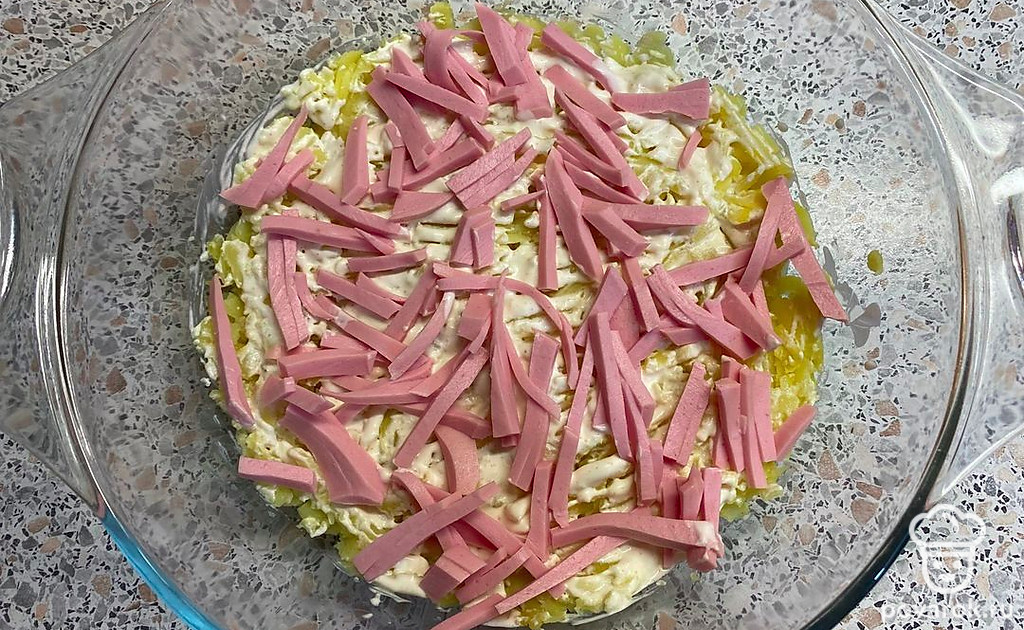 Колбасу нарежем соломкой, выложим сверху на картошку.
