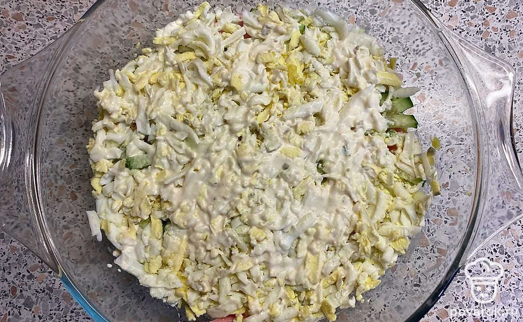 Яйца натираем на крупной терке. Выкладываем их следующим слоем. Солим и смазываем майонезом.