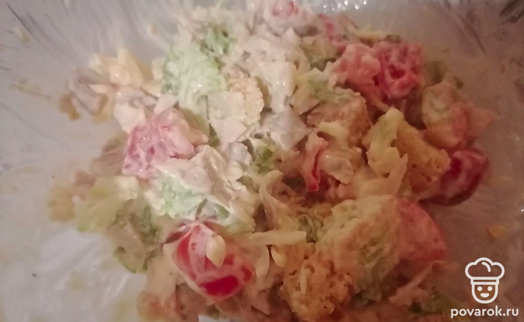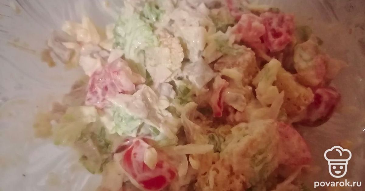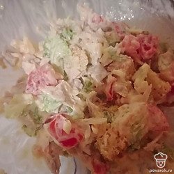 Все ингредиенты соединить в миске, посолить, добавить сухарики, заправить майонезом и перемешать.