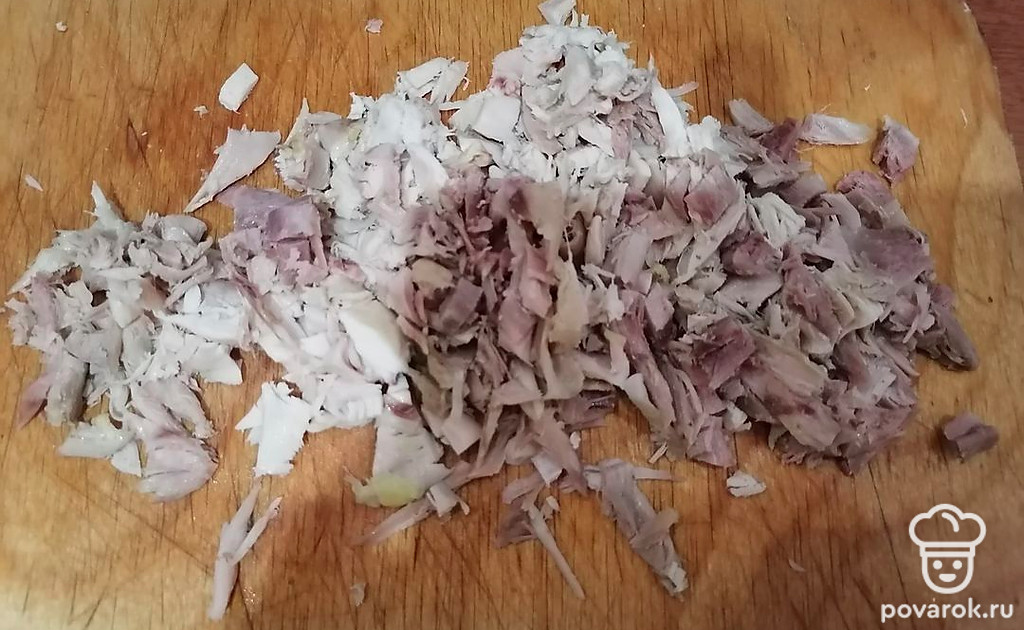 Курицу отварить в подсоленной воде до готовности около 40-60 минут. Вынуть кости и нарезать мякоть небольшими кусочками.