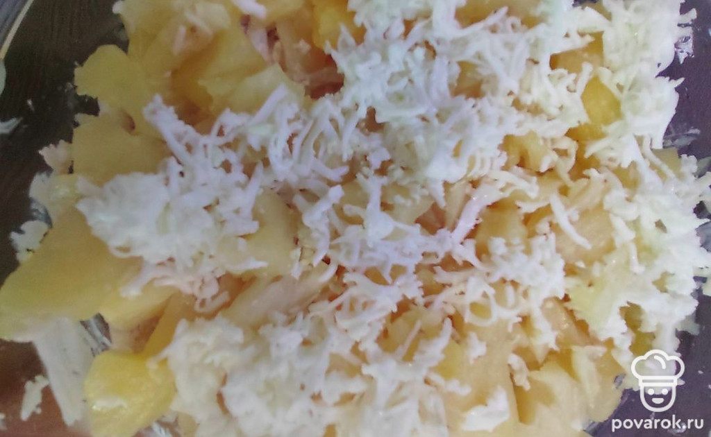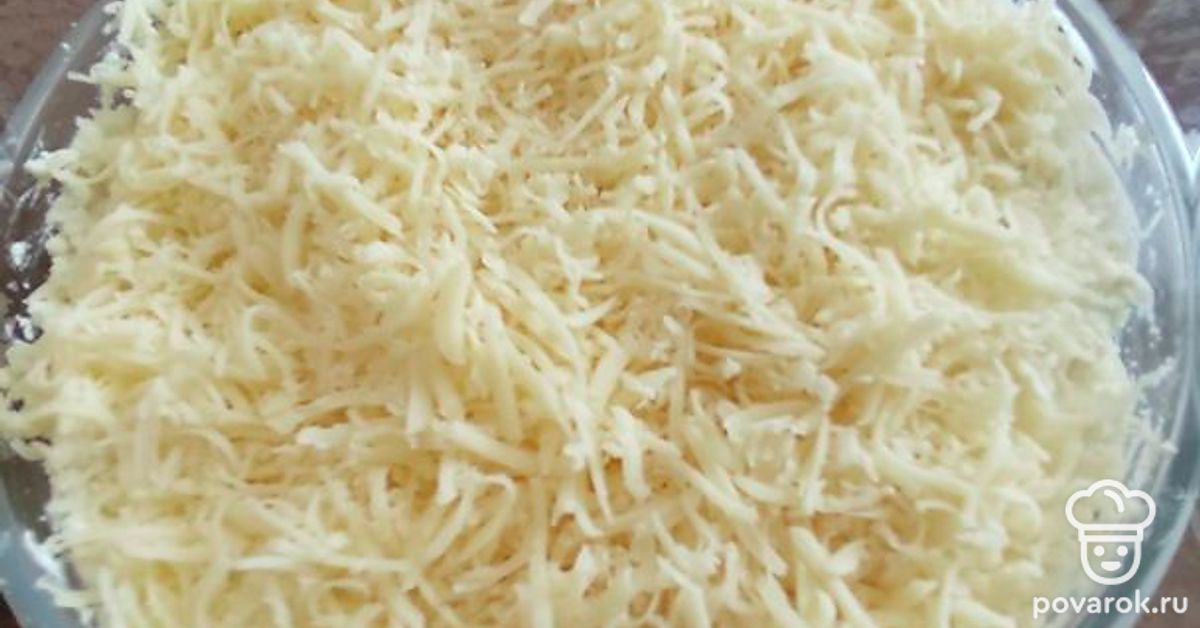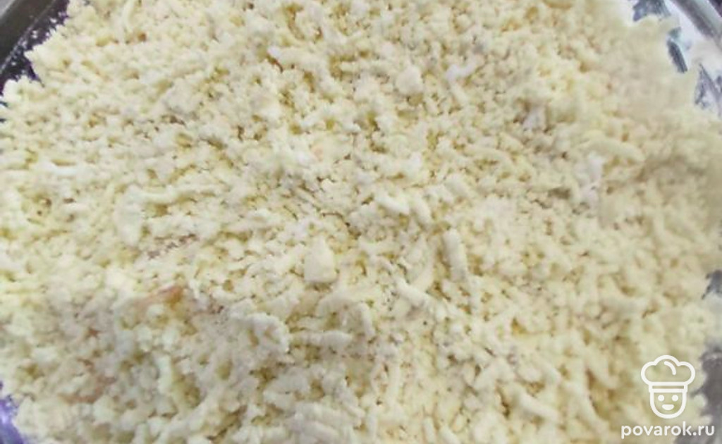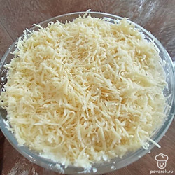 Следующий слой — натертый на мелкой терке твердый сыр. Далее натираем яичный желток, и можно подавать. В общем салат готов. Но мне нравится больше, когда сделан в два этапа, то есть слои опять повторяются: курица, майонез, ананасы кусочками, натертый куринный белок, майонез, сыр, майонез, желток. Мне больше нравится, когда при завершении сверху остается сыр.