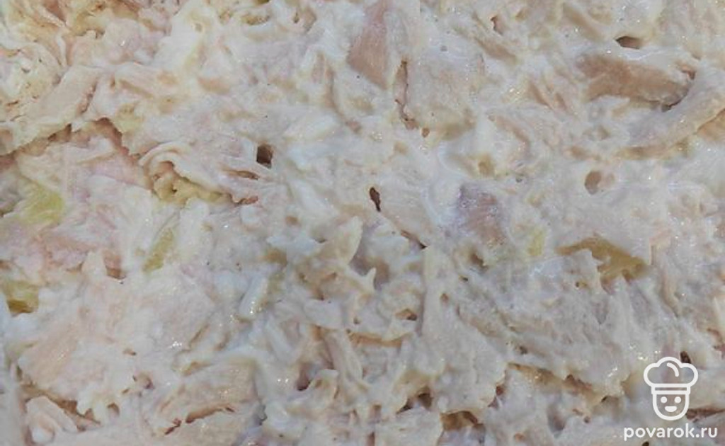 Даем остыть, нарезаем или рвем тонкими кусочками курицу, смазываем майонезом. Это будет первый слой.