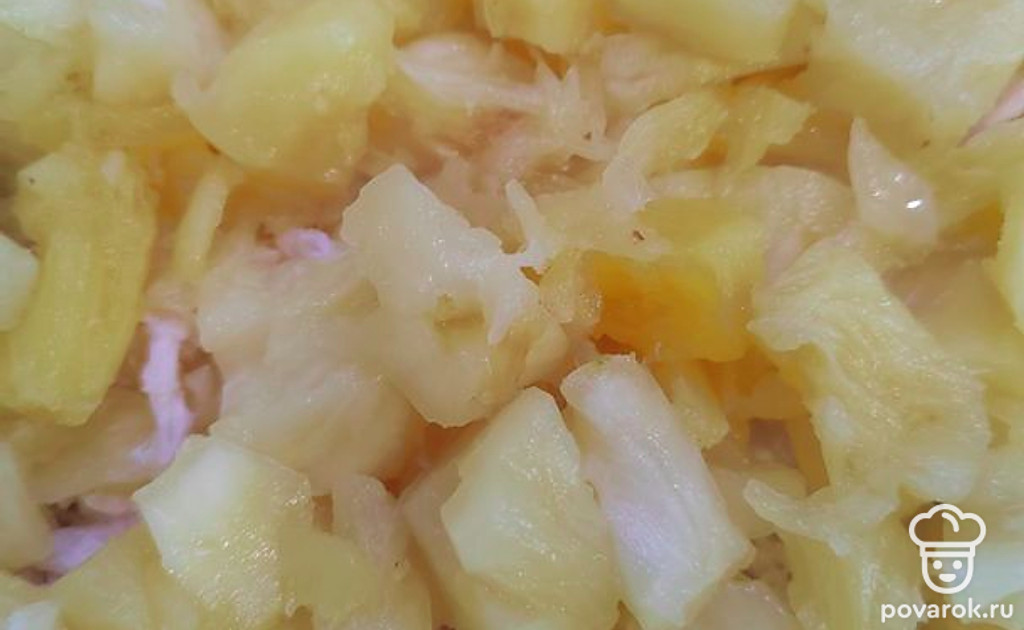 Потом укладываем слой мелко нарезанных кусочков консервированного ананаса.