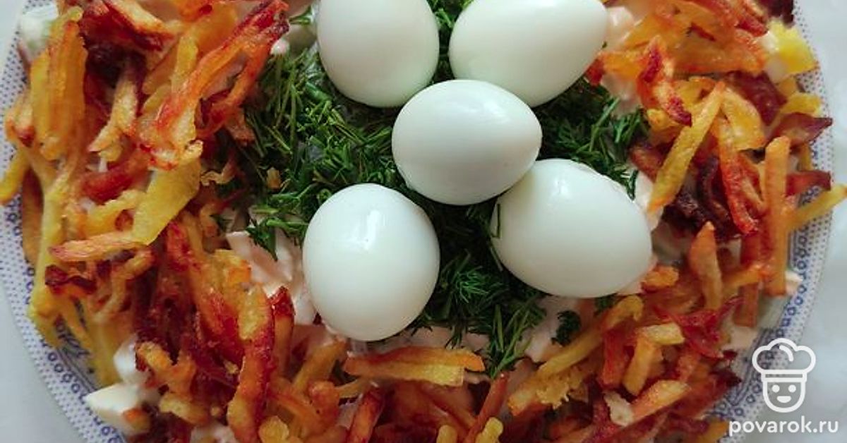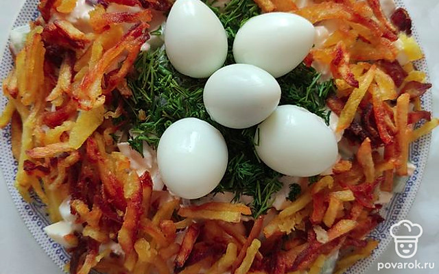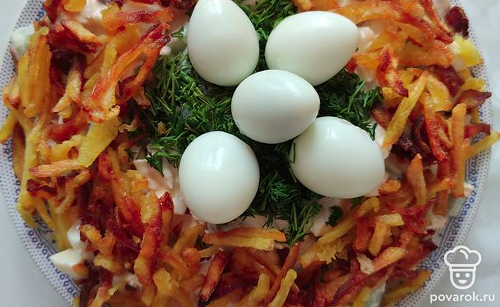 Салат «Гнездо» с копченой курицей и перепелиным яйцом