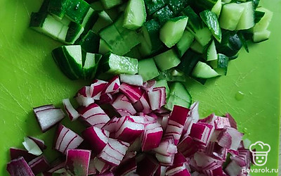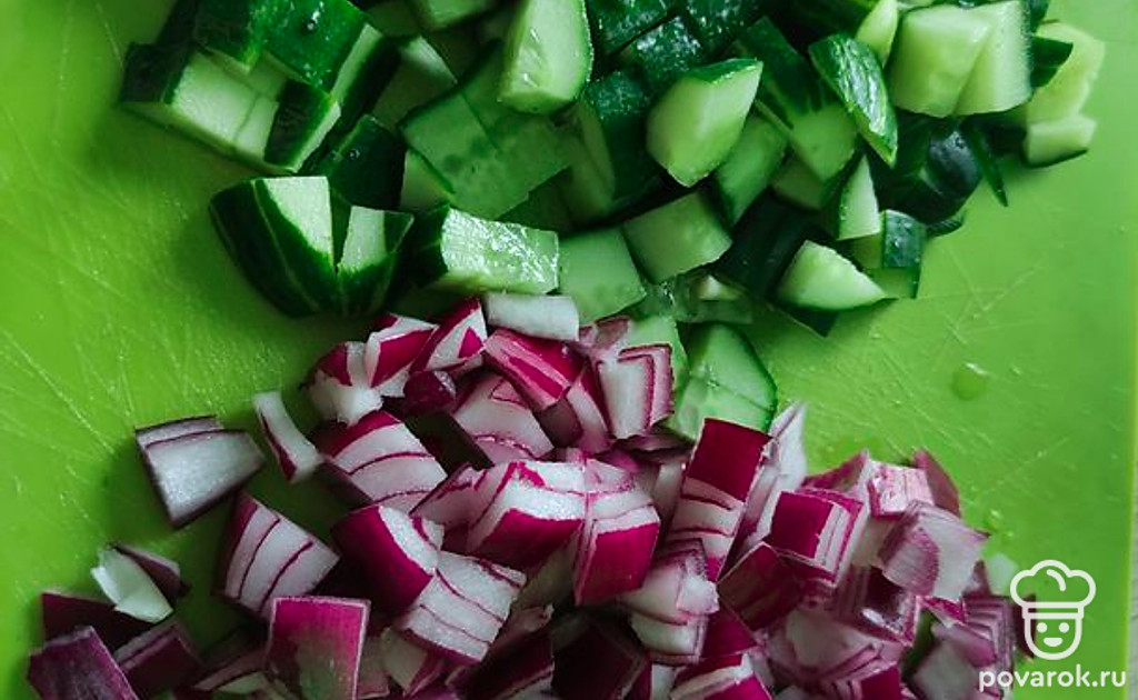 Нарезаем огурец и лук крупными кубиками.