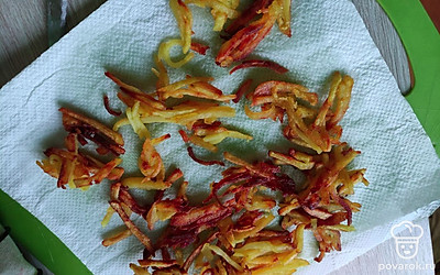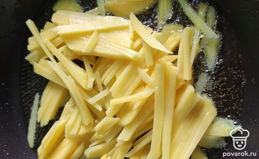 Нарезаем картофель тонкой соломкой, обжариваем в большом количестве масла.