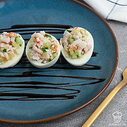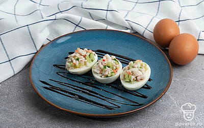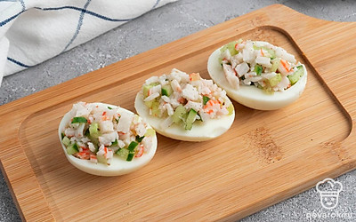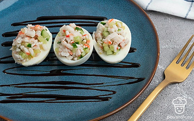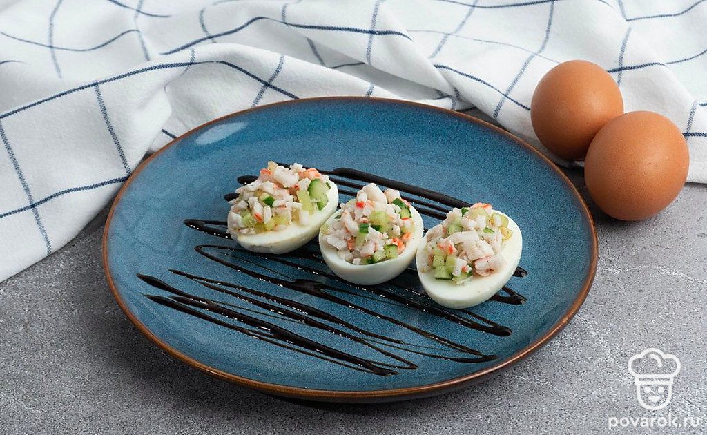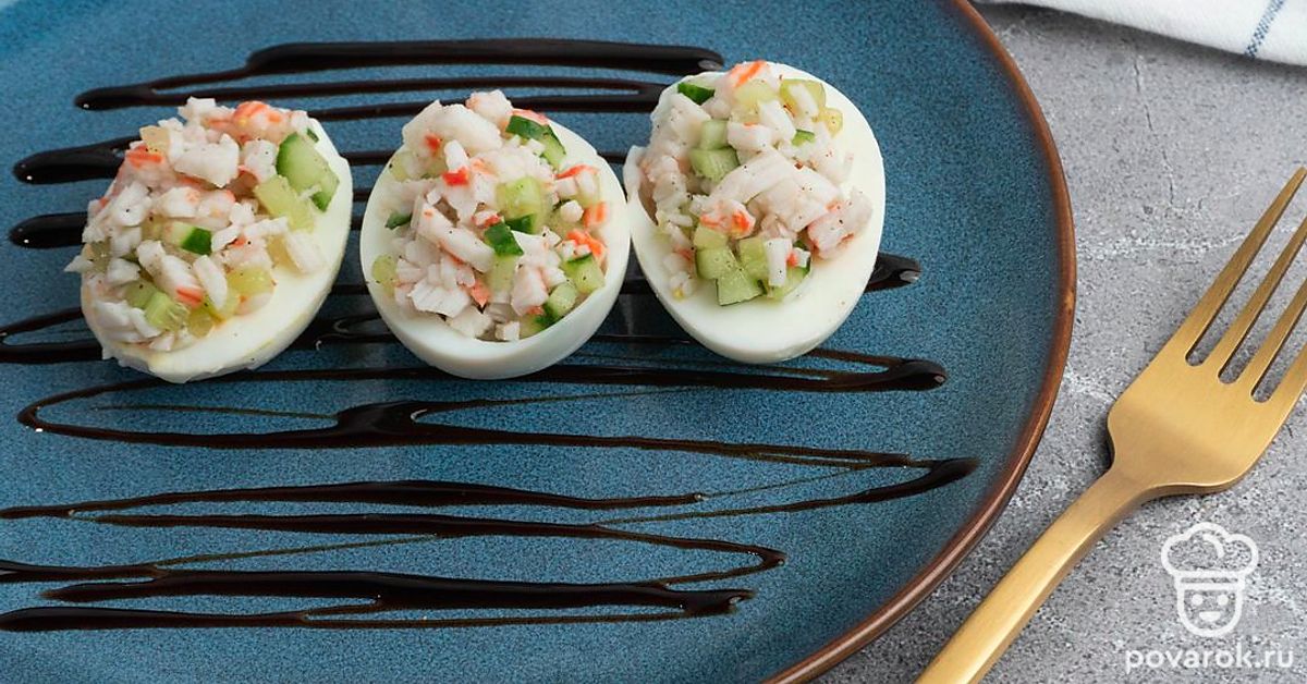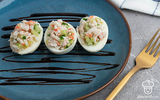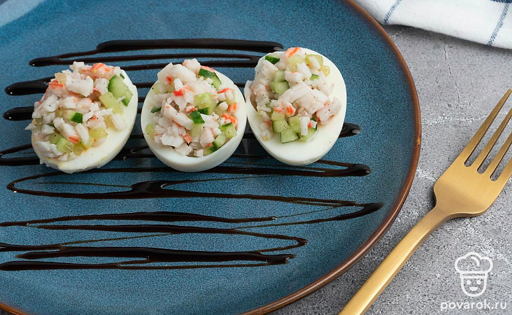 Очень часто фаршированный яйца называют дьявольской русской закуской, хотя впервые это блюдо стали подавать отнюдь не в России. Дьявольскими их называли из-за традиционной наполнения закуски и частой подачи с терпкой острой горчицей, майонезом или уксусом, нередко посыпают солью с перцем при подаче. Наш вариант не исключение, соль и перец также присутствует. Они прекрасно дополняют мягкий вкус начинки из огурца и крабовых палочек.