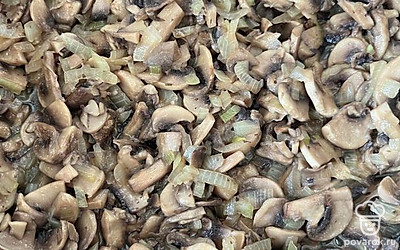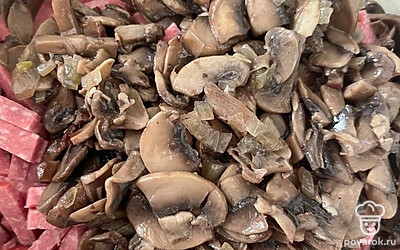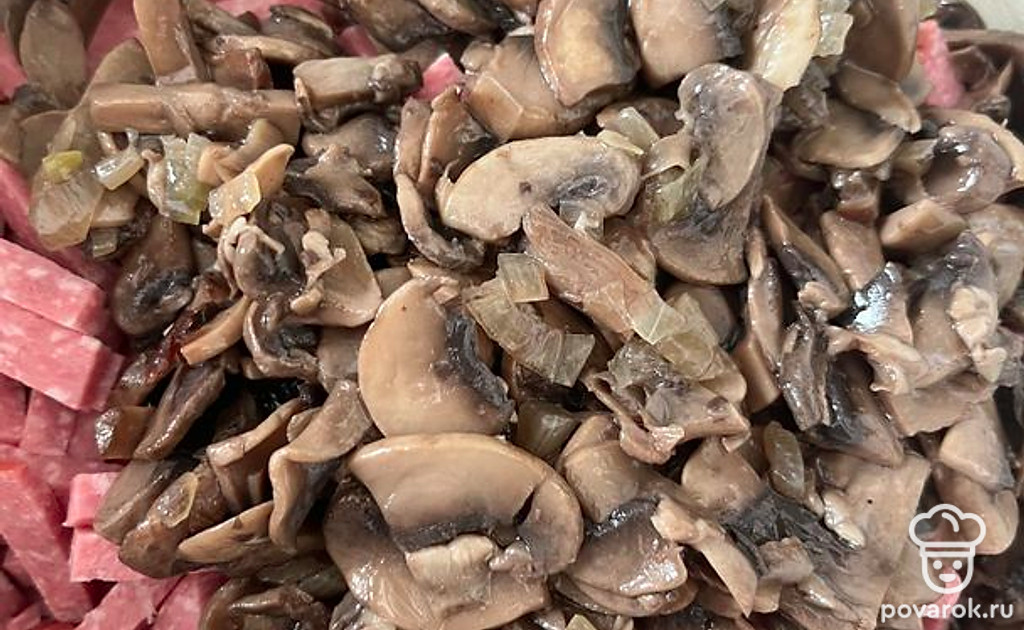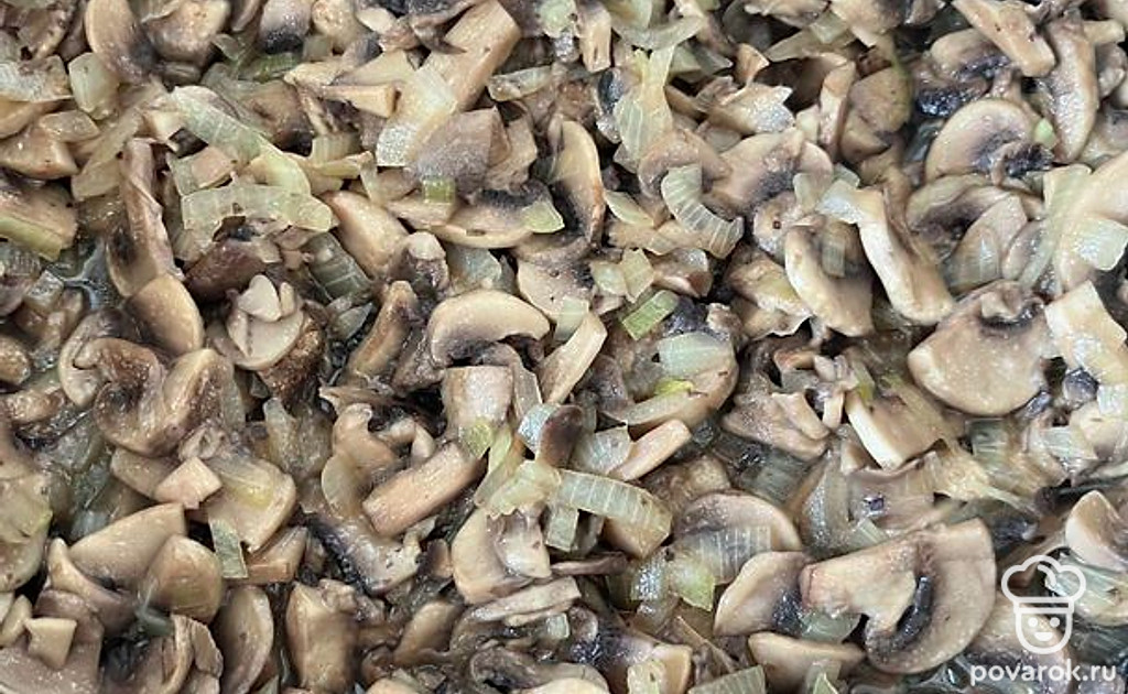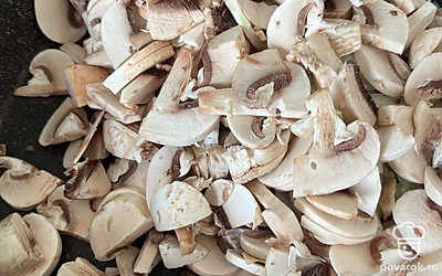 Шампиньоны мелко нарезаем и отправляем на сковородку.