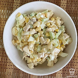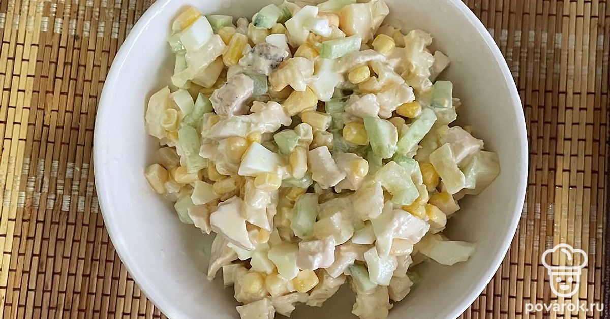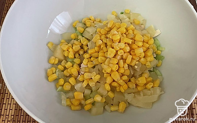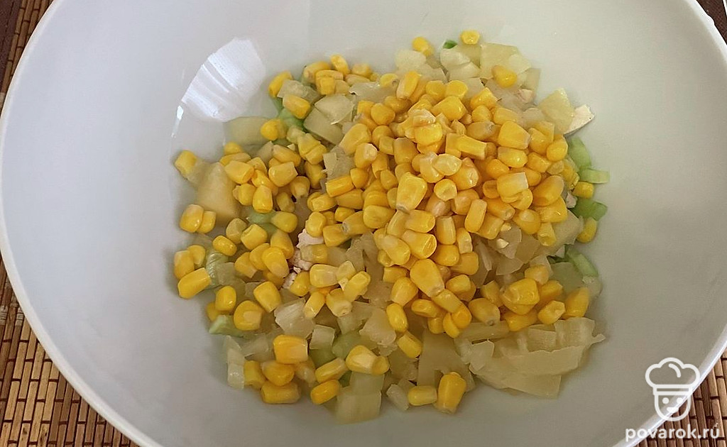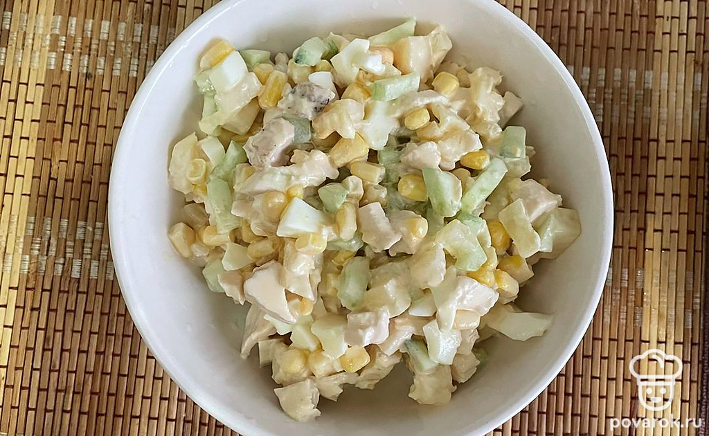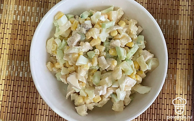 Кукурузу, вареные яйца кубиком добавьте в салат. Заправьте все майонезом и перемешайте.