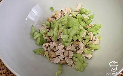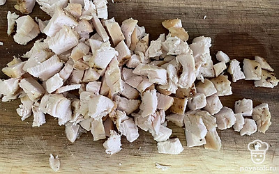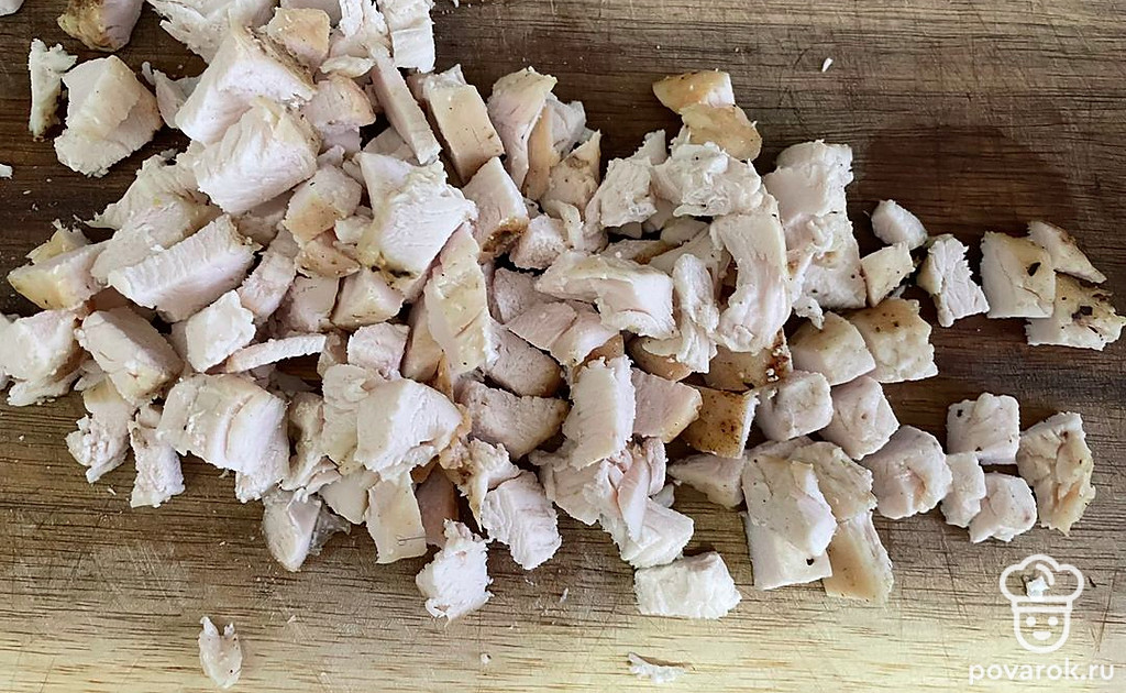 Для начала запеките куриную грудку. Мясо помойте и оботрите бумажным полотенцем, натрите солью и маслом, заверните в фольгу. Запекайте 40 минут при 180 градусах. Готовое филе разберите на волокна или нарежьте кубиком.