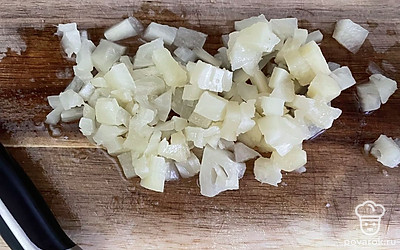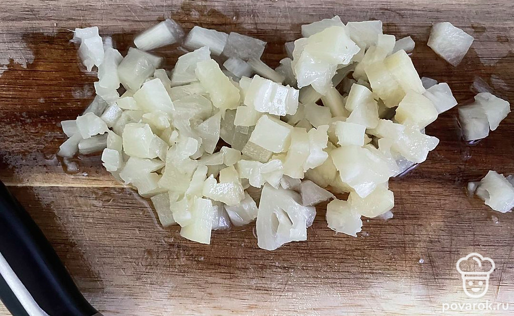 Измельчите консервированные ананасы и добавьте к остальным ингредиентам.