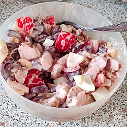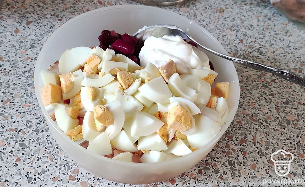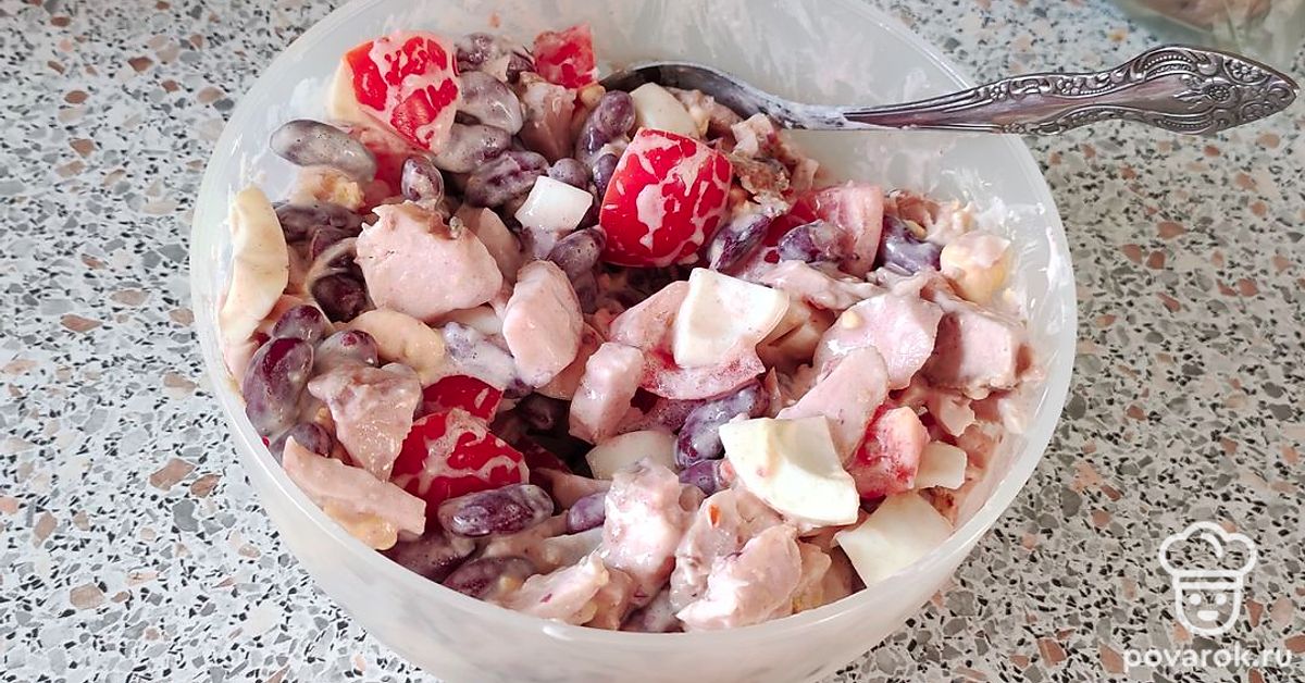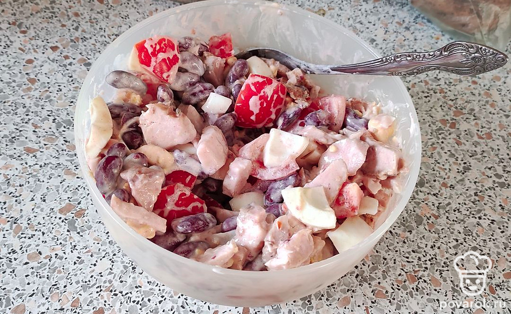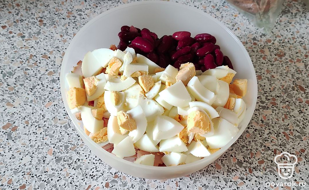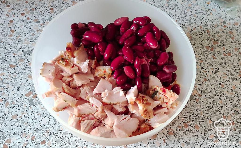 Фасоль консервированная. Из фасоли сливаем лишнюю жидкость, добавляем в салат.