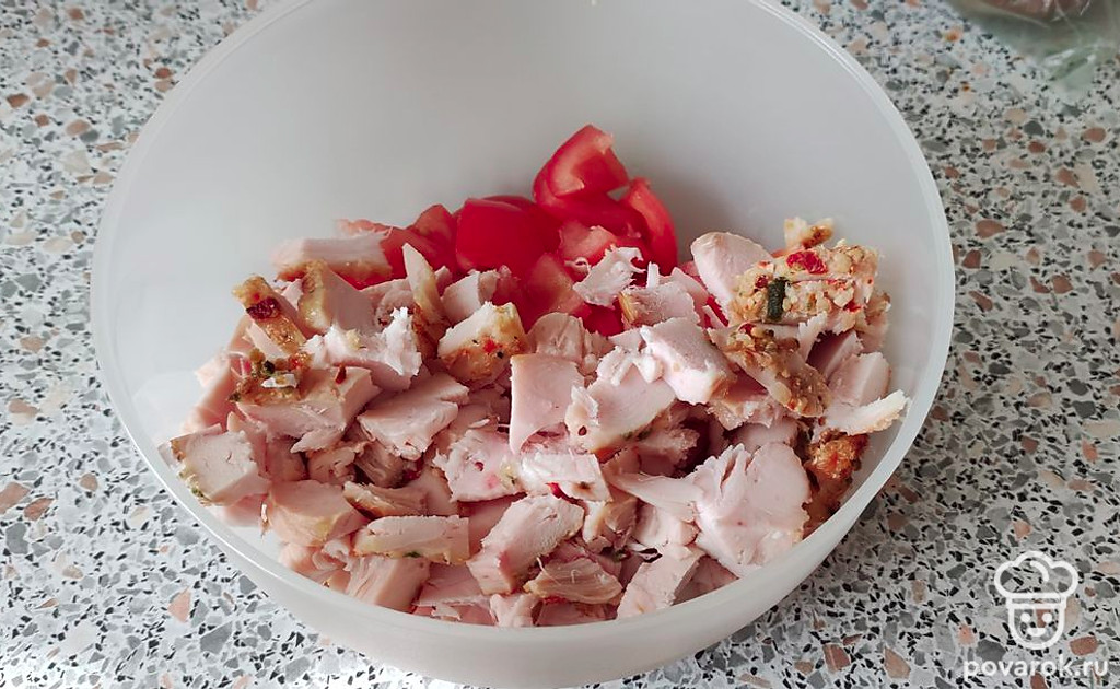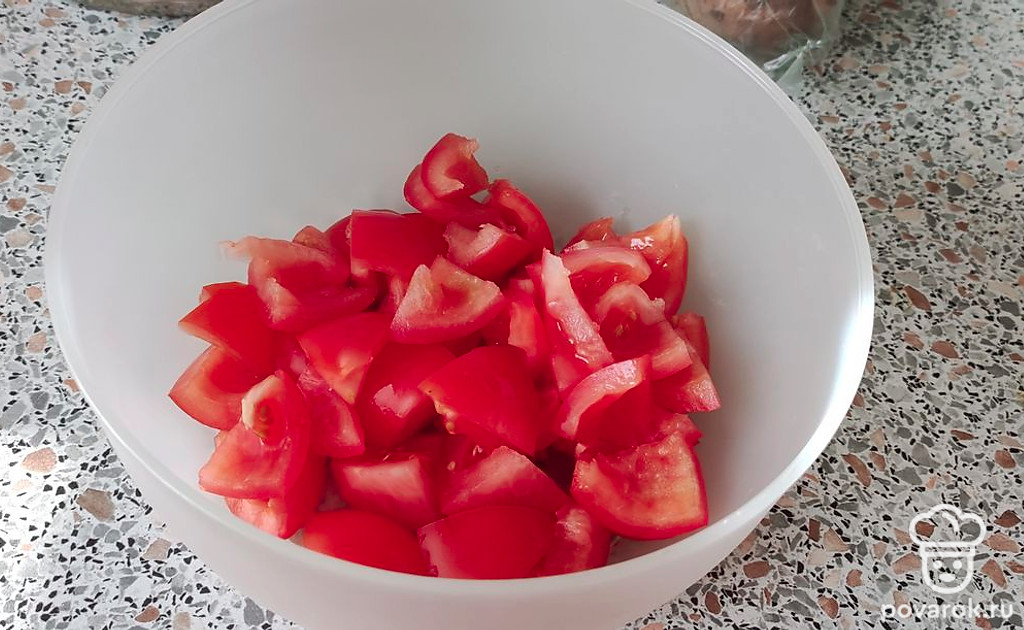 Помидоры моем, вычищаем середину, где жидкость, режем на кубики.