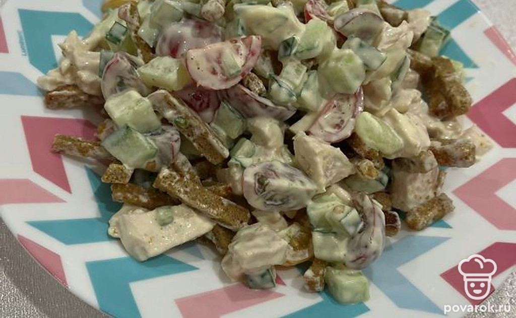 Добавить сухарики, майонез и перемешать. Посолить по вкусу.
