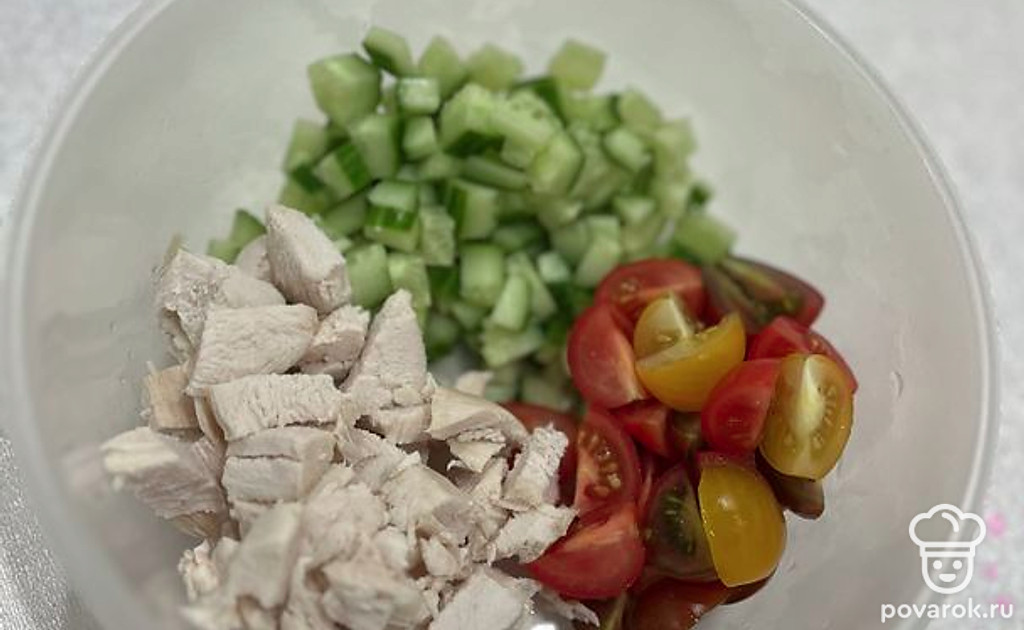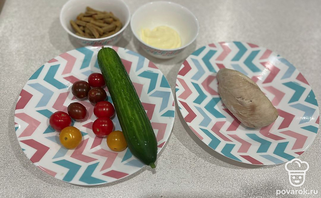 Отварить куриную грудку в подсоленной воде 30 минут. Подготовить остальные ингредиенты.