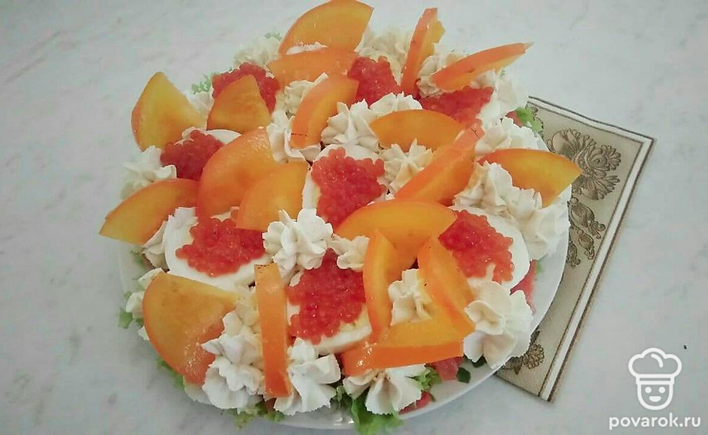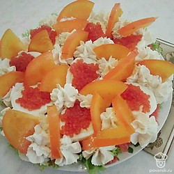 Любители и ценители красной рыбы очень любят сочетать ее с различными мягкими сырами. В данном рецепте присутствуют оба ингредиента, но мало кто пробовал к этому тандему прибавить еще и хурму. Данное блюдо, благодаря такому сочетанию, приобретает не только необычный вкус, но и является кладезю полезных веществ для нашего организма. Такой салат станет украшением любого стола и приятно удивит гостей своим вкусом и внешним видом.