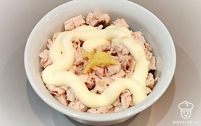 Добавляем майонез, тертый чеснок и соль.