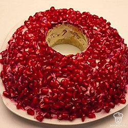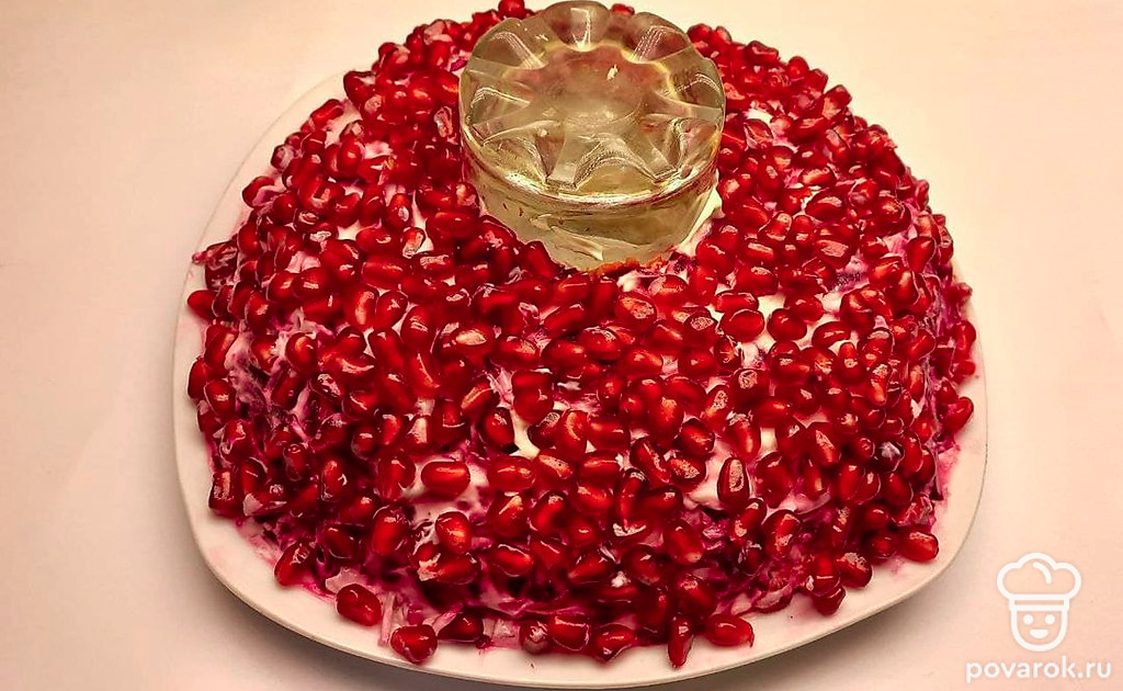 На слой моркови выложите свеклу, смажьте этот слой майонезом. Завершающим слоем посыпьте зерна граната. Вращающим движением выньте стакан. Уберите салат в холодильник на несколько часов, украсьте и подавайте к столу.