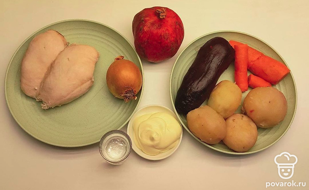 Натрите на крупной терке морковь, картофель и свеклу. Лук порежьте полукольцами и маринуйте в уксусе. Курицу нарежьте кубиком. Гранат очистите от зерен.