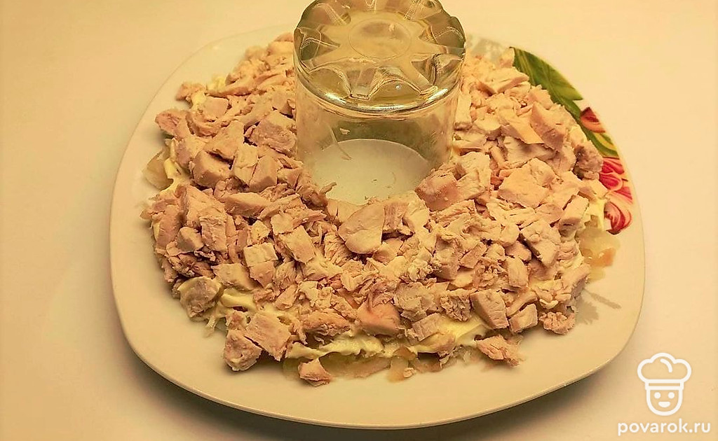 Чтобы выстроить форму браслета, в середину тарелки поместите стакан. Вокруг стакана выложите слои салата. Первым слоем выложите отварной картофель, смажьте его майонезом, затем на него выложите кусочки нарезанного куриного филе.