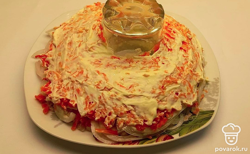 Следом за курицей выложите маринованный в уксусе лук и смажьте его тонким слоем майонеза. На лук выложите натертую морковь и также смажьте майонезом.