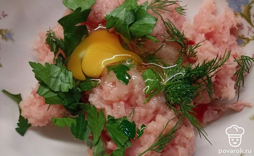 Измельчите курицу удобным способом. Можете мелко нарезать, измельчить в блендере. Добавьте нашинкованную зелень, яйцо, соль.
