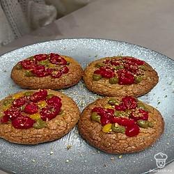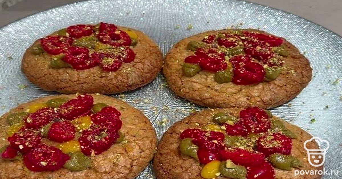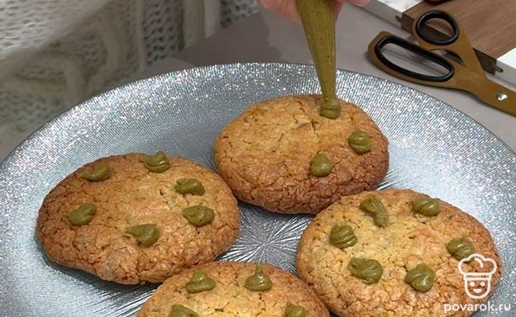 То же самое проделайте и с малиной! После того, как оба джема и фисташковое пралине будут готовы, переложите все массы по кондитерским мешкам и украсьте печенье. Приятного аппетита и с наступающим вас!