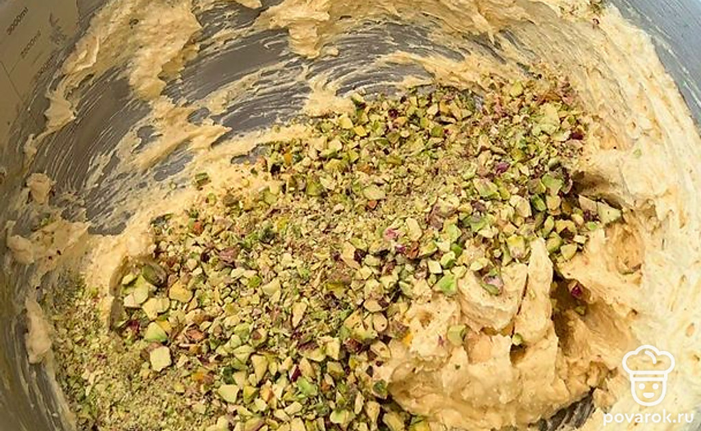 Высыпьте измельченные фисташки в массу. После перемешивания введите муку, щепотку соды и измельченный белый шоколад. Финально смешайте все ингредиенты до плотного, однородного теста.