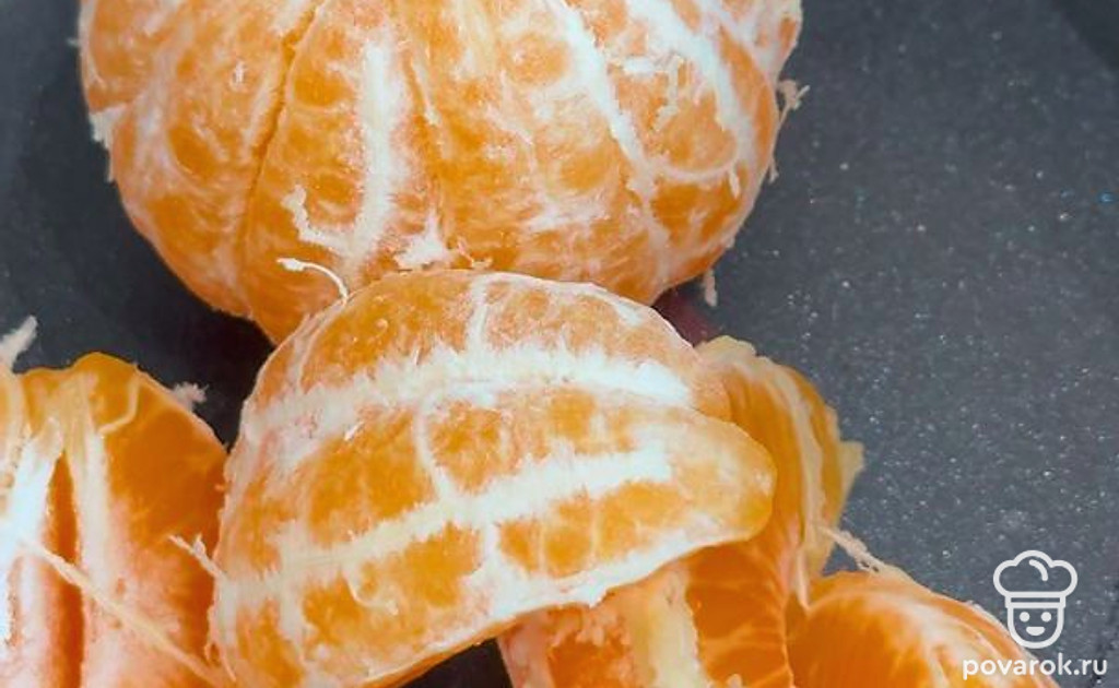 Для джемов очистите мандарины от кожуры — выбирайте фрукты без косточек! Выложите мандарины в сотейник, засыпьте 150 г сахара и уварите на медленном огне около 15 минут.