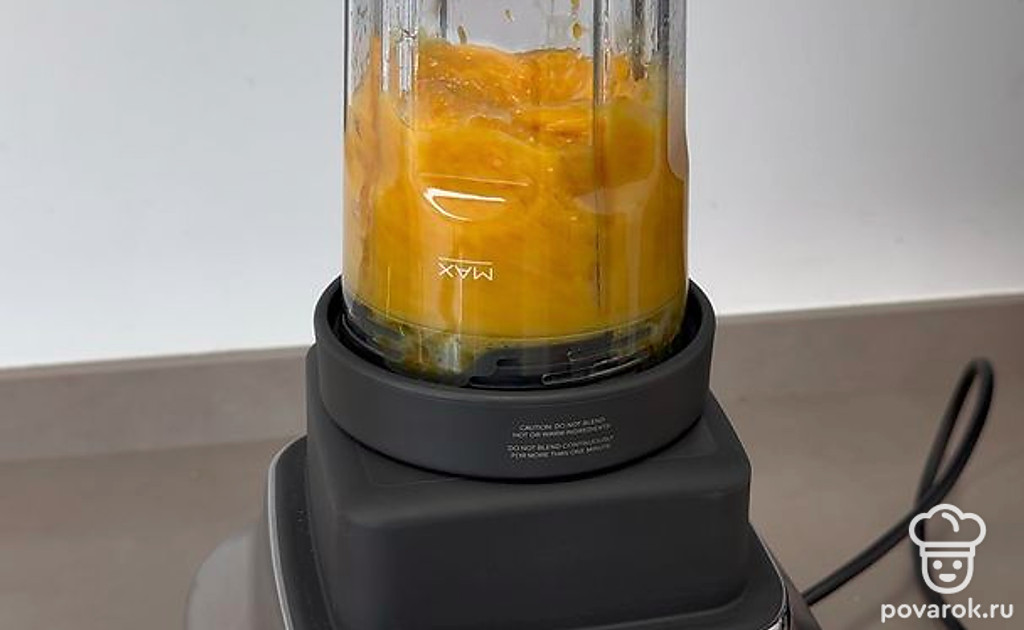 После добавьте в небольшое количество воды столовую ложку крахмала, перемешайте до однородности и влейте в мандариновую смесь, тщательно перемешайте массу еще раз! Пробейте джем через сито либо в блендере.