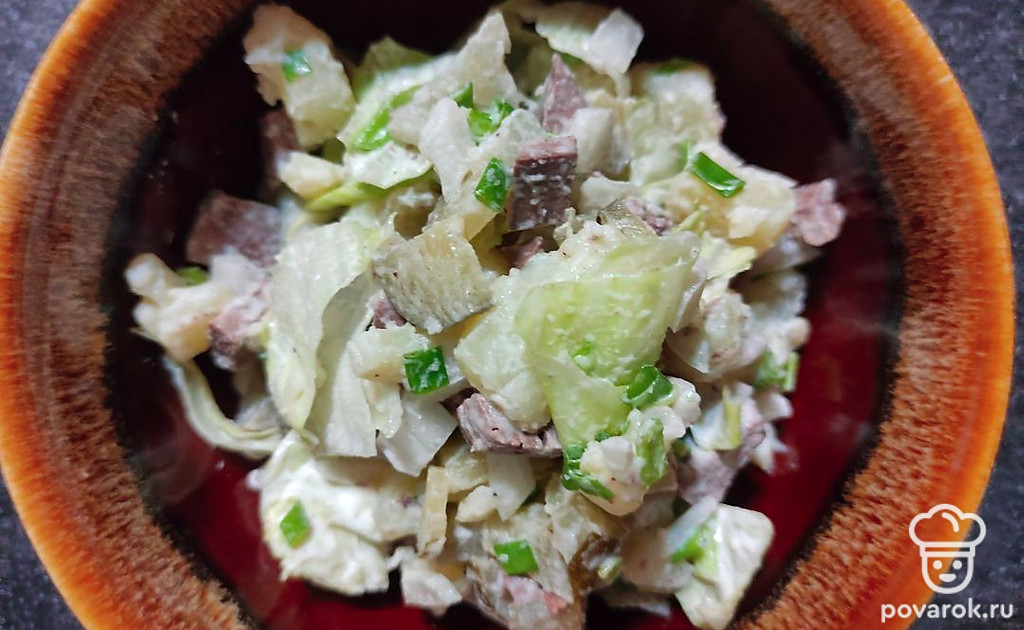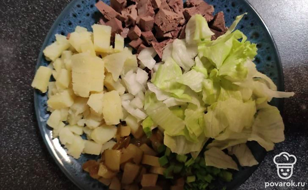 Нарежьте салат айсберг, соленые огурцы кубиком, лук репчатый и зелёный лук, картофель и печень кубиком.