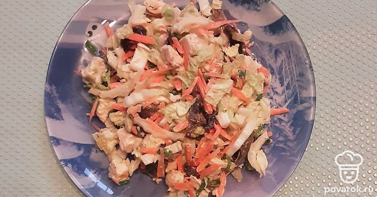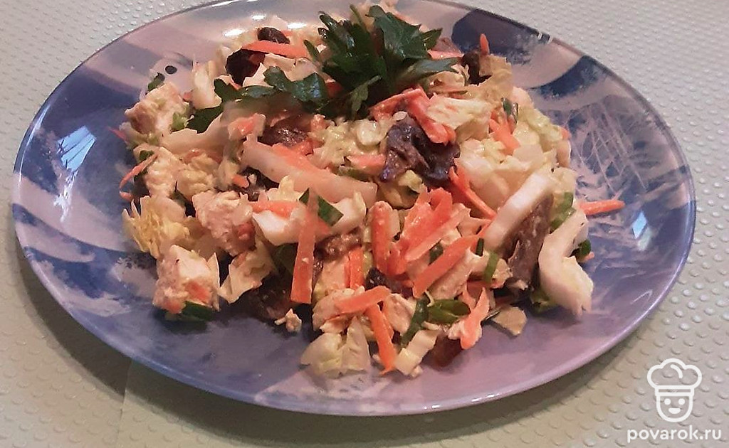 Изысканный салат из шампиньонов, пекинской капусты и куриного филе