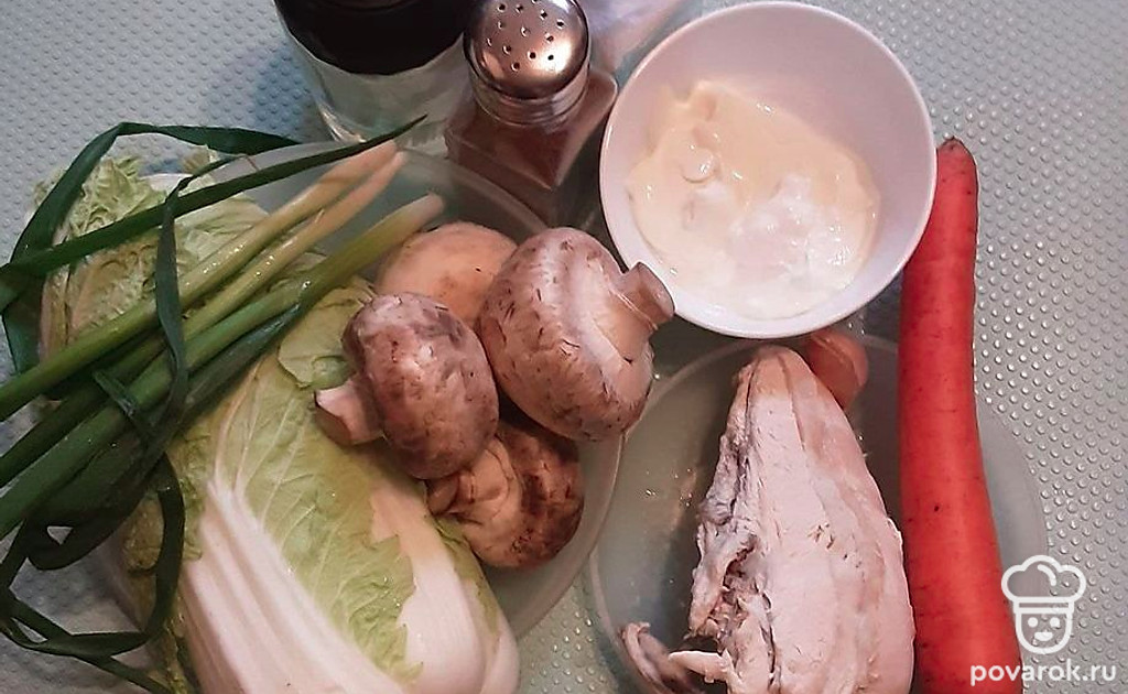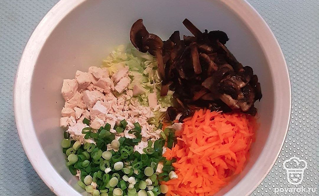 Шампиньоны промойте, почистите, сняв пленки со шляпок. Также срежьте потемневшие срезы на ножках. Хорошо обсушите грибы, иначе напитавшись влагой, они станут водянистыми. Нарежьте шампиньоны дольками. Пекинскую капусту помойте и тонко нашинкуйте, убрав толстые белые листья. Отварное куриное филе нарежьте мелкими кубиками. Морковь почистите и натрите на крупной терке. Зелёный лук мелко порубите. Чеснок пропустите через пресс.