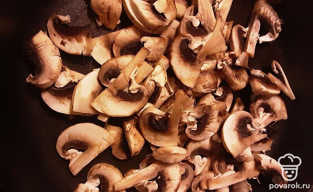 Шампиньоны выложите на горячую сковороду, смазанную растительным маслом и обжарьте до готовности периодически помешивая. В конце жарки грибы посолите, поперчите.