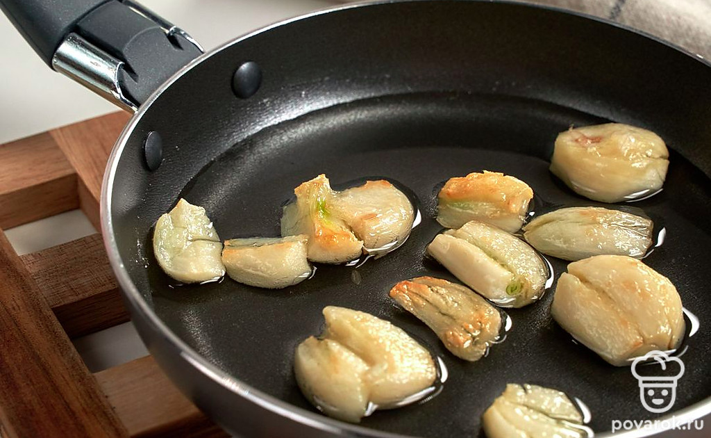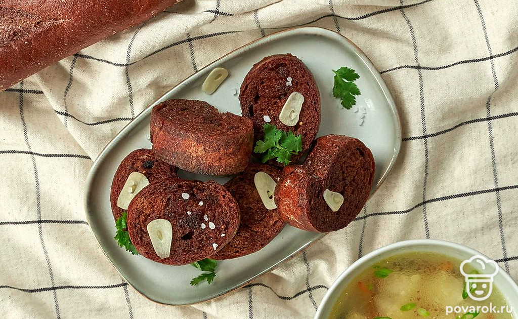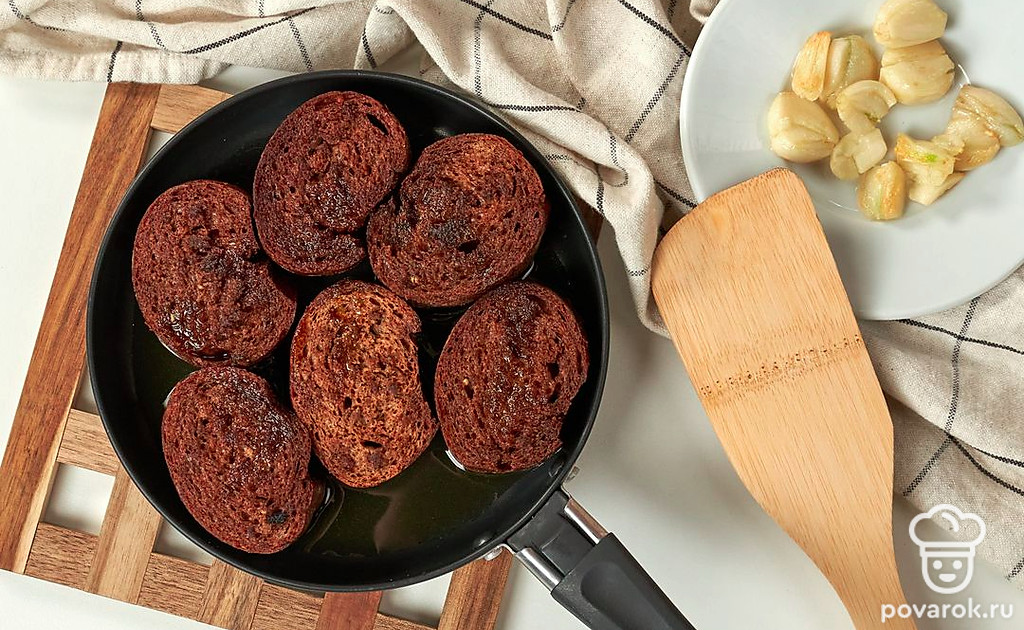 Тем, у кого с вечера остались кусочки нарезанного хлеба, стоит воспользоваться рецептом жареного багета. Гренки готовятся на сковороде буквально за 10 минут, еще 5 займет подготовка чесночного масла. Кроме чеснока в блюдо можно добавить любые специи и пряности. Главное, соблюдайте меру, чтобы вкус обжаренного хлеба получился не слишком насыщенным. Если покупаете чеснок в магазине, выбирайте головки сухие и плотные. Кулинары советуют брать чеснок небольшого размера — он имеет более тонкий вкус.