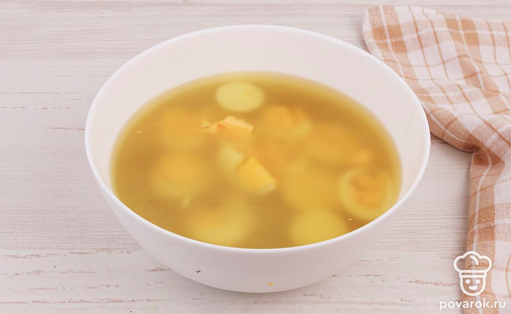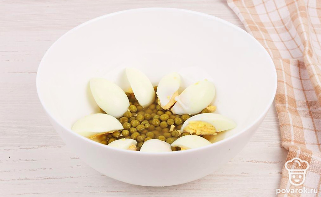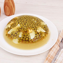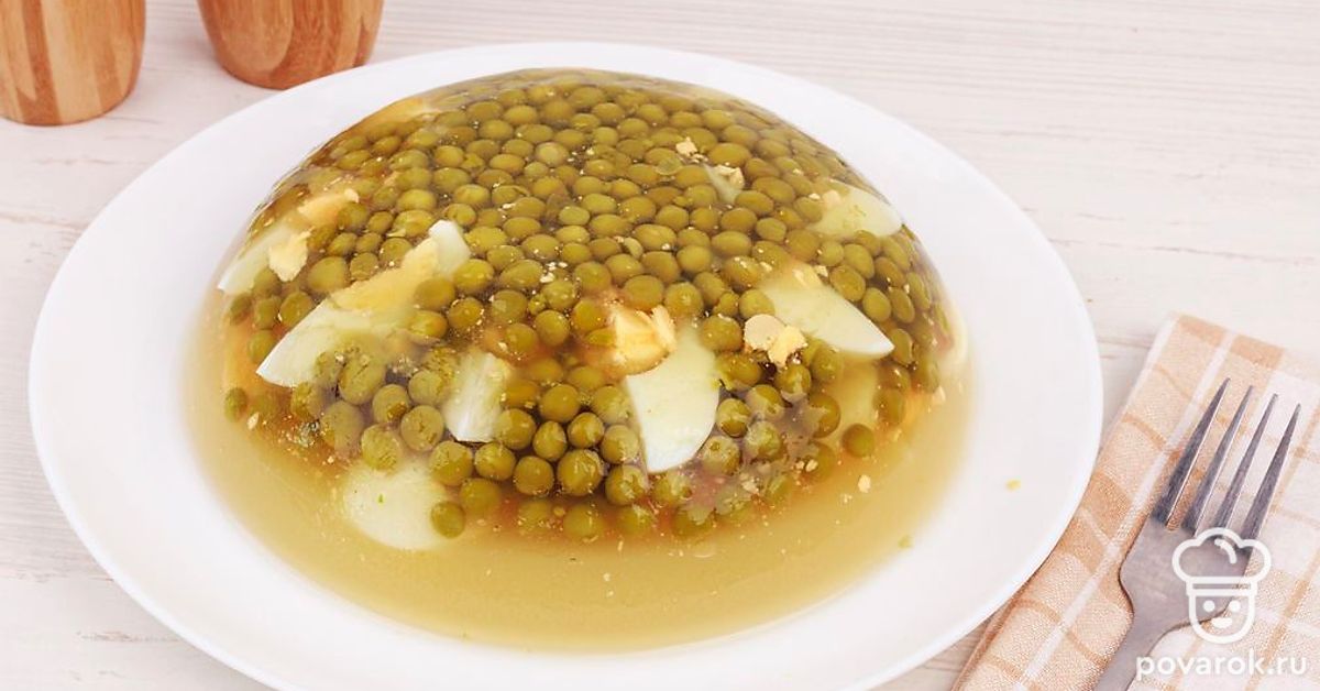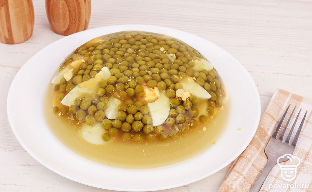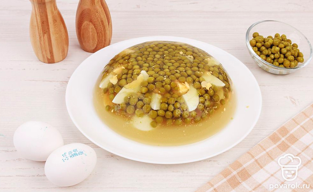 Заливные блюда были придуманы в Советской России в качестве праздничной альтернативы. Приготовление этого блюда превратилось в новогоднюю традицию многих русских семей. Чтобы заливное получилось удачным, его нужно выдержать определенное время в холоде. Секретом застывания таких блюд является желатин. Его добавляют в жидкость, которой заливают блюдо. Это может быть овощной или мясной бульон. В этом рецепте заливное приготовлено из консервированного горошка, отварных куриных яиц в мясном бульоне!