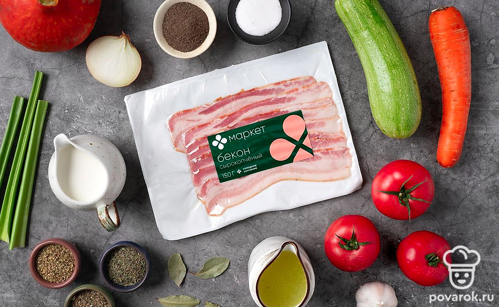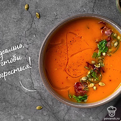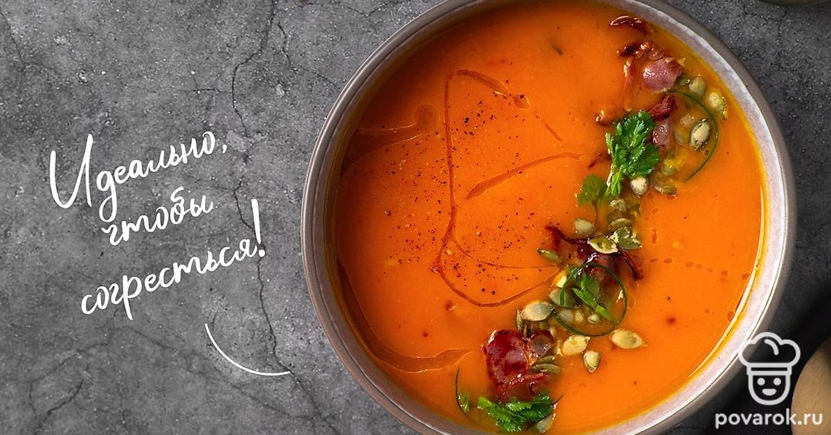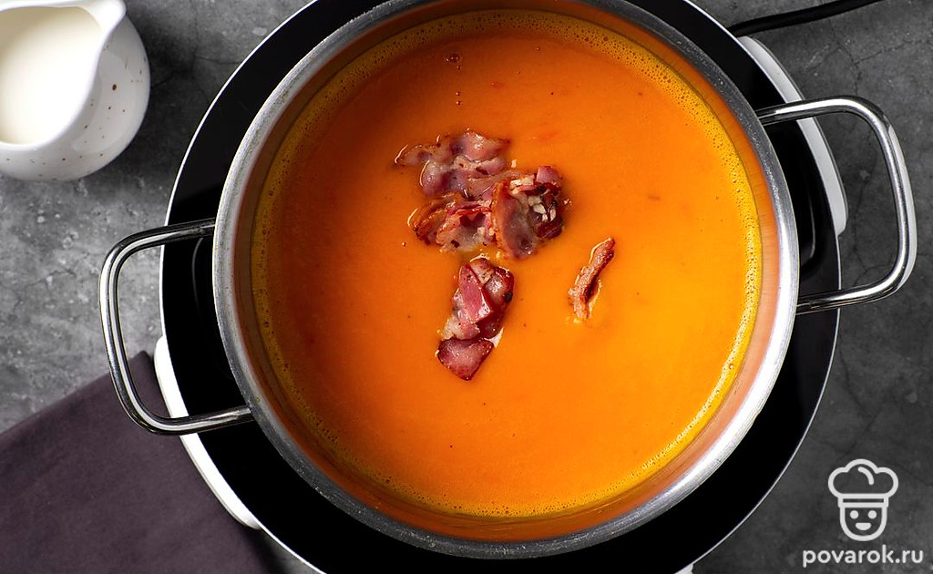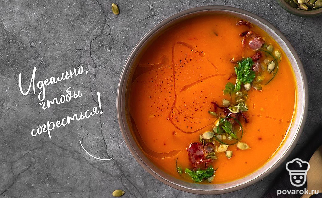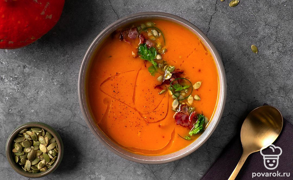 Пряный тыквенный крем-суп станет отличным вариантом осеннего обеда. Хрустящий жареный бекон придаст блюду пикантности. А мясной бульон в сочетании со сливками и овощами сделают суп очень сытным. Для приготовления лучше всего взять мускатную тыкву. Она считается самой вкусной и сладкой из всех. Ее мякоть плотная, а волокон там не так много, как в других сортах. Когда будете чистить тыкву, не выбрасывайте семечки — их можно обжарить и украсить готовое блюдо.