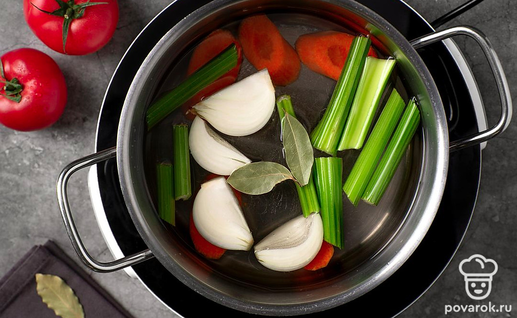 Срежьте верхнюю и нижнюю части луковицы и разрежьте ее на четвертинки. Сварите бульон: в большую кастрюлю добавьте луковицу, сельдерей, морковь и лавровый лист. Доведите до кипения и варите 90-100 минут. В процессе варки постоянно снимайте пену ложкой, иначе бульон получится мутным и невкусным. И не накрывайте кастрюлю крышкой — конденсат тоже может испортить вкус.